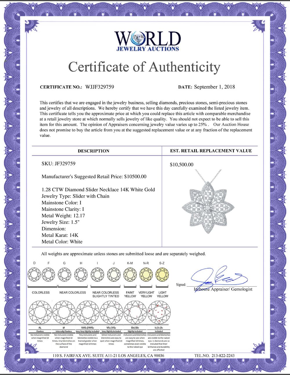 All property is sold “AS IS”, and ALL SALES ARE FINAL. Property is open to thorough public inspection. It is the Bidder’s responsibility to determine condition, age, genuineness, value or any other determinative factor. WJA may attempt to describe the merchandise in advertising and on the Internet but makes no representations. In no event shall WORLD JEWELRY AUCTION be held responsible for having made or implied any warranty of merchantability or fitness for a particular purpose. Bidder shall be the sole judge of value.