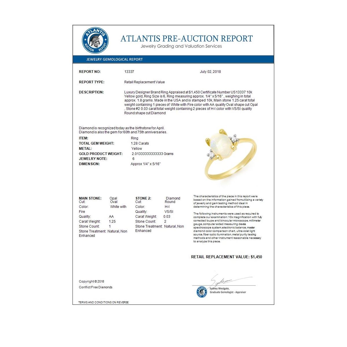 REF-22K2W -13337 ---- 1.28 CTW Opal & Diamond Ring 10K Yellow Gold ---- Luxury Designer Brand Ring Appraised at $1,450 Certificate Number US13337 10k Yellow gold, Ring Size is 6, Ring measuring approx. 1/4" x 5/16" , weighing in total approx. 1.8 grams. Made in the USA and is stamped 10k, Main stone 1.25 carat total weight containing 1 pieces of White with Fire color with AA quality Oval shape cut Opal , Stone #2 0.03 carat total weight containing 2 pieces of H-I color with VS/SI quality Round shape cut Diamond