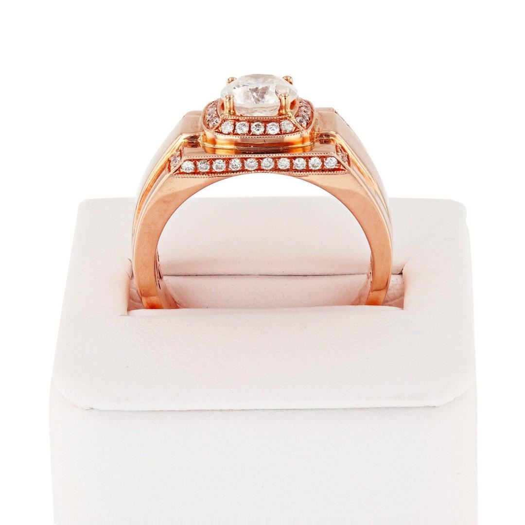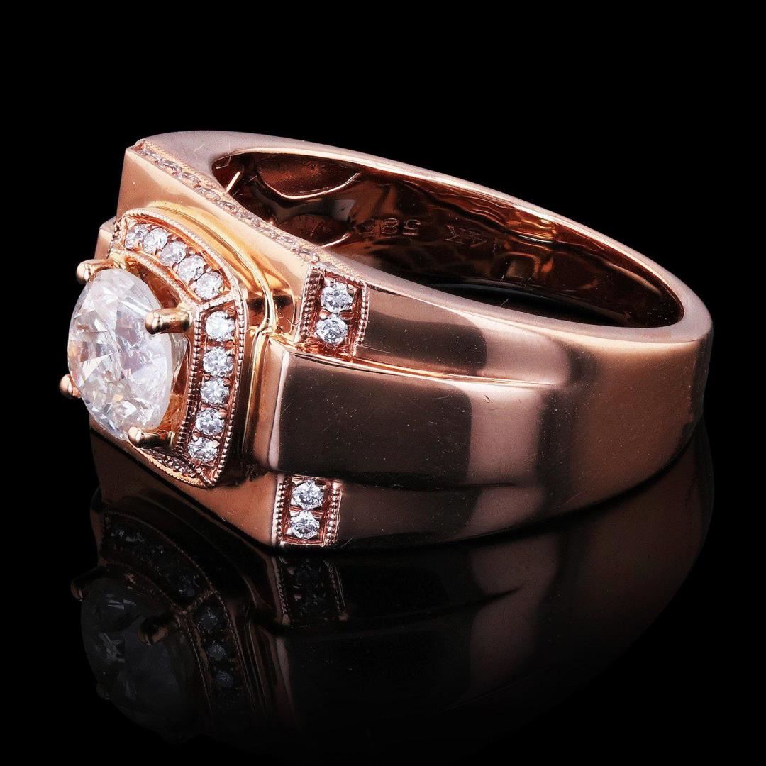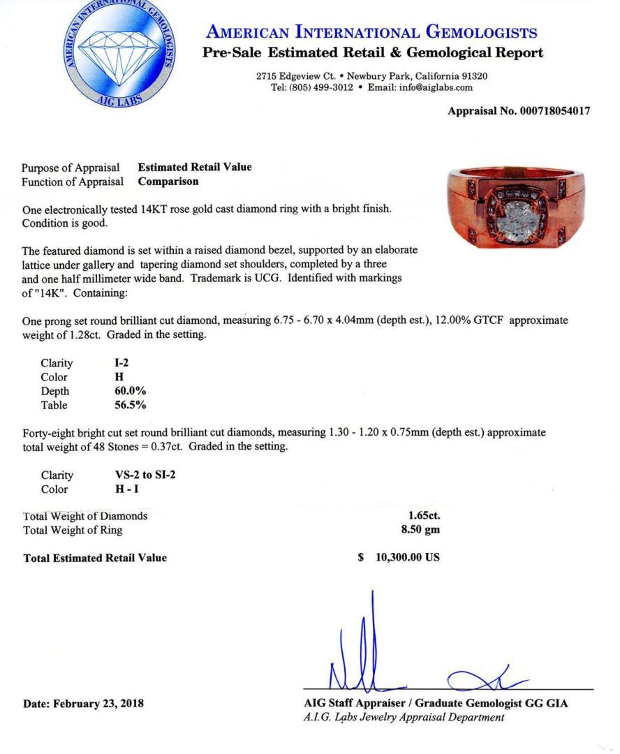 One electronically tested 14KT rose gold cast diamond ring with a bright finish. Condition is good. The featured diamond is set within a raised diamond bezel, supported by an elaborate lattice under gallery and tapering diamond set shoulders, completed by a three and one half millimeter wide band. Trademark is UCG. Identified with markings of "14K". Containing: One prong set round brilliant cut diamond, measuring 6.75 - 6.70 x 4.04mm (depth est.), 12.00% GTCF approximate weight of 1.28ct. Graded in the setting. Clarity I2 Color H Depth 60.0% Table 56.5% Forty-eight bright cut set round brilliant cut diamonds, measuring 1.30 - 1.20 x 0.75mm (depth est.) approximate total weight of 48 Stones = 0.37ctw. Graded in the setting. Clarity VS2 to SI2 Color H - I Total Weight of Diamonds 1.65ctw. Total Weight of Ring 8.50 gm