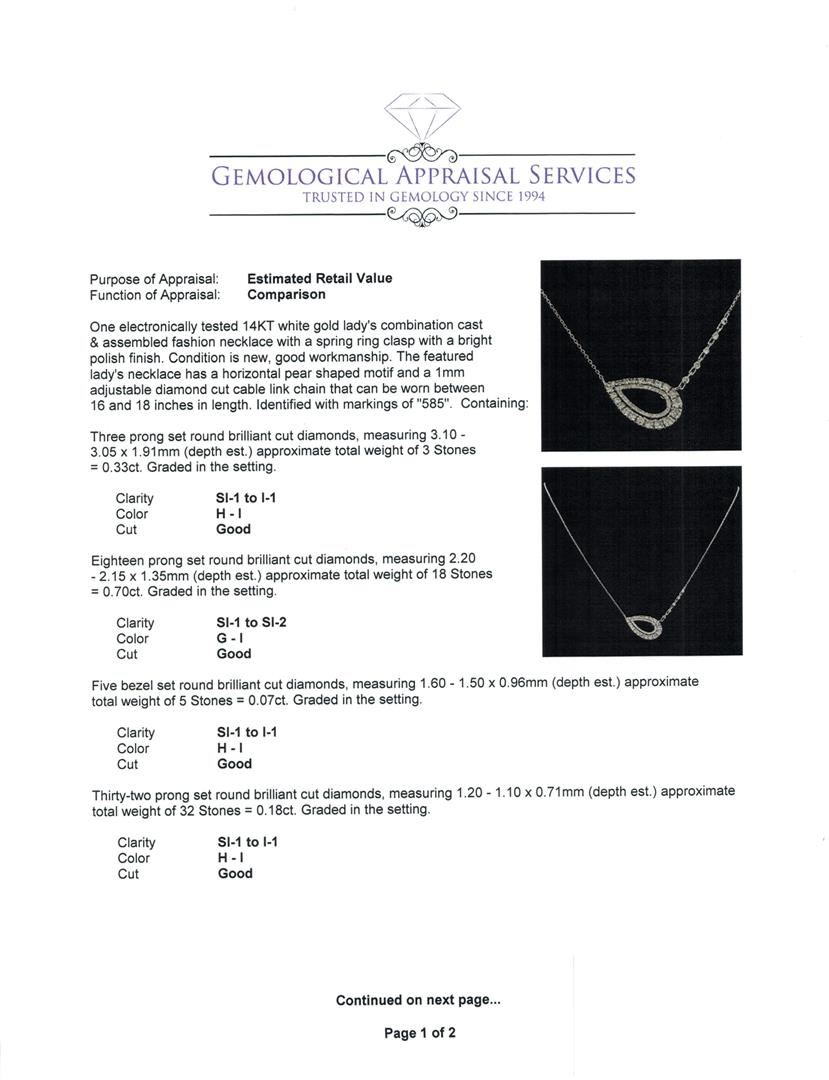 One electronically tested 14KT white gold lady's combination cast & assembled fashion necklace with a spring ring clasp with a bright polish finish. The featured lady's necklace has a horizontal pear shaped motif and a 1mm adjustable diamond cut cable link chain that can be worn between 16 and 18 inches in length. Identified with markings of '585'. Condition is new, good workmanship. Containing: Three prong set round brilliant cut diamonds, measuring 3.10 - 3.05 x 1.91mm (depth est.) approximate total weight of 3 Stones = 0.33ct. Graded in the setting. Clarity SI-1 to I-1. Color: H - I Cut Good Eighteen prong set round brilliant cut diamonds, measuring 2.20 - 2.15 x 1.35mm (depth est.) approximate total weight of 18 Stones = 0.70ct. Graded in the setting. Clarity SI-1 to SI-2. Color: G - I Cut Good Five bezel set round brilliant cut diamonds, measuring 1.60 - 1.50 x 0.96mm (depth est.) approximate total weight of 5 Stones = 0.07ct. Graded in the setting. Clarity SI-1 to I-1. Color: H - I Cut Good Thirty-Two prong set round brilliant cut diamonds, measuring 1.20 - 1.10 x 0.71mm (depth est.) approximate total weight of 32 Stones = 0.18ct. Graded in the setting. Clarity SI-1 to I-1. Color: H - I Cut Good. Total Weight of Diamonds 1.28ct.. Total Weight of Necklace 4.30gm. GAS Appraised at $3,745.00.
