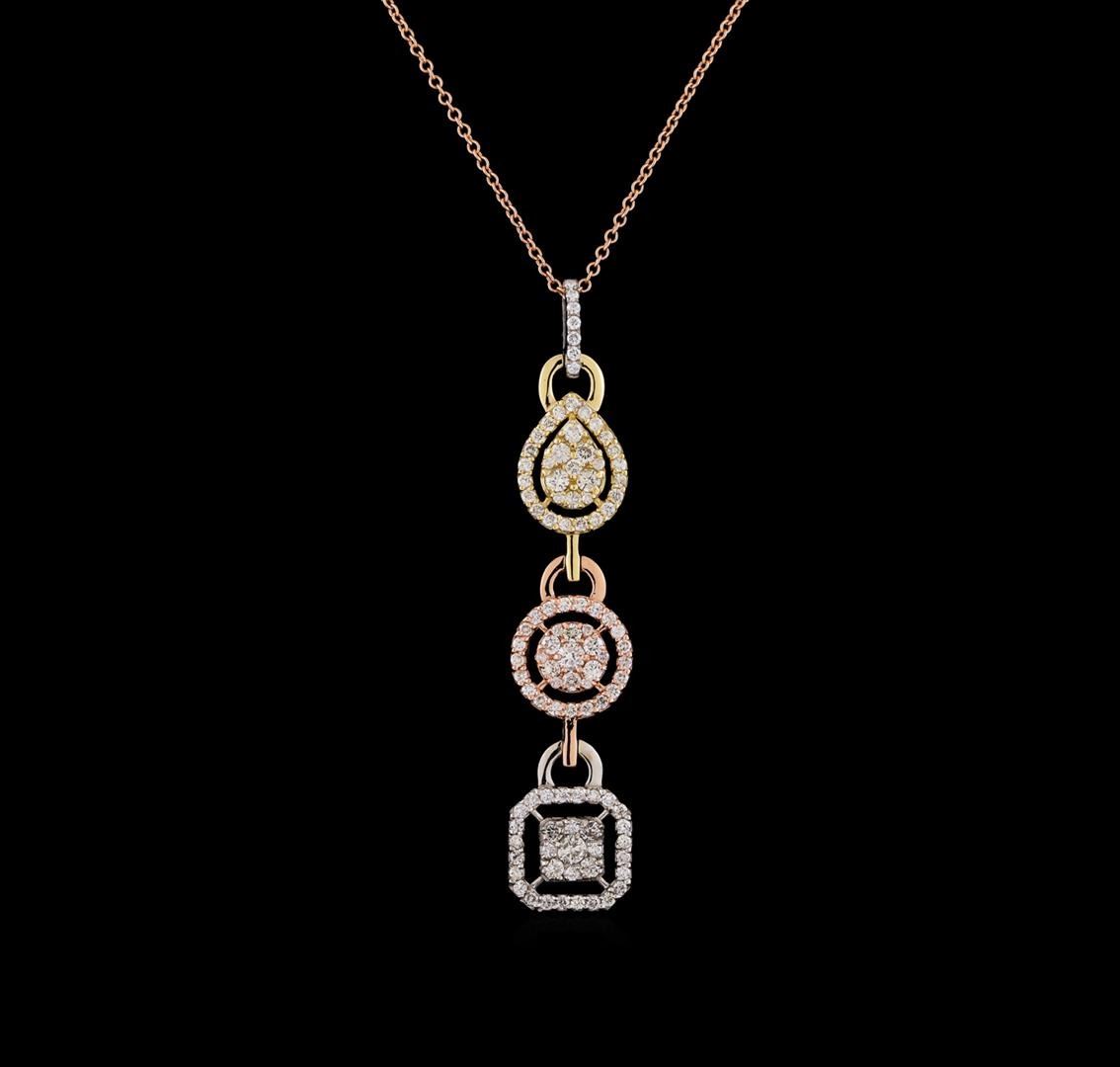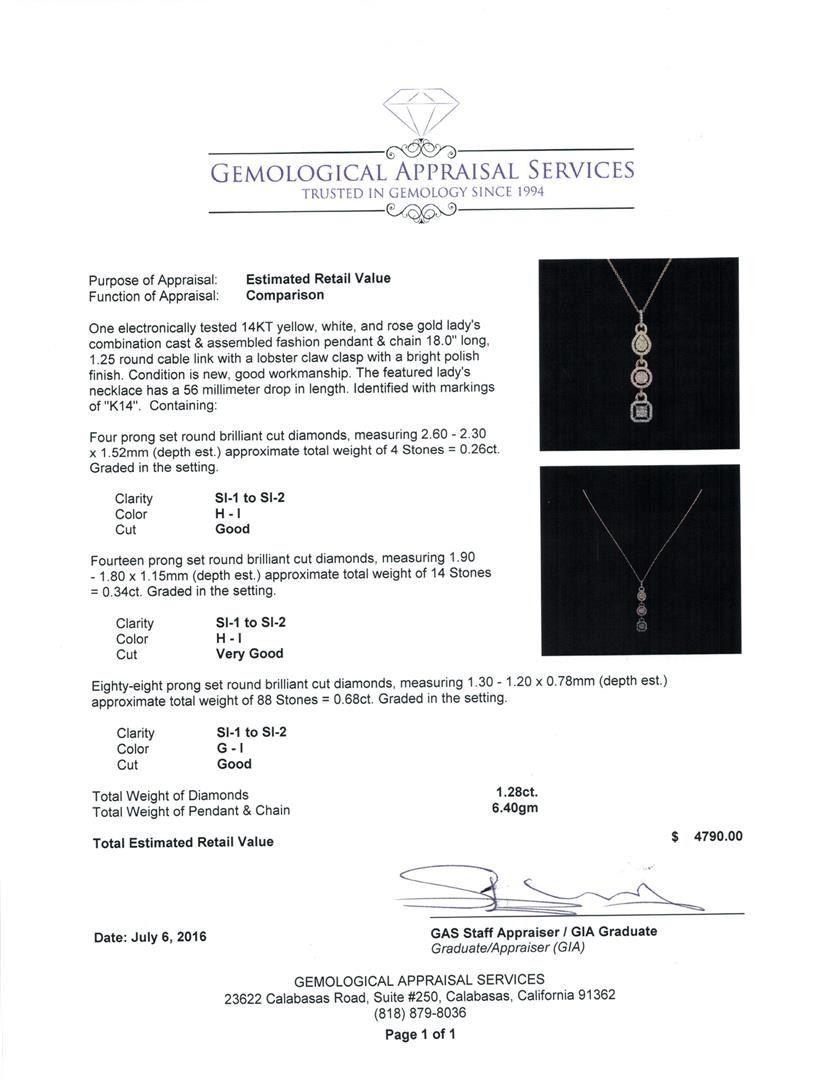 One electronically tested 14KT yellow, white, and rose gold lady's combination cast & assembled fashion pendant & chain 18.0" long, 1.25 round cable link with a lobster claw clasp with a bright polish finish. The featured lady's necklace has a 56 millimeter drop in length. Identified with markings of "K14". Condition is new, good workmanship. Containing: Four prong set round brilliant cut diamonds, measuring 2.60 - 2.30 x 1.52mm (depth est.) approximate total weight of 4 Stones = 0.26ct. Graded in the setting. Clarity: SI-1 to SI-2. Color: H - I. Cut Good Fourteen prong set round brilliant cut diamonds, measuring 1.90 - 1.80 x 1.15mm (depth est.) approximate total weight of 14 Stones = 0.34ct. Graded in the setting. Clarity: SI-1 to SI-2. Color: H - I. Cut Very Good Eighty-Eight prong set round brilliant cut diamonds, measuring 1.30 - 1.20 x 0.78mm (depth est.) approximate total weight of 88 Stones = 0.68ct. Graded in the setting. Clarity: SI-1 to SI-2. Color: G - I. Cut Good. Total Weight of Diamonds 1.28ct. Total Weight of Pendant & Chain 6.40gm. GAS Appraised.