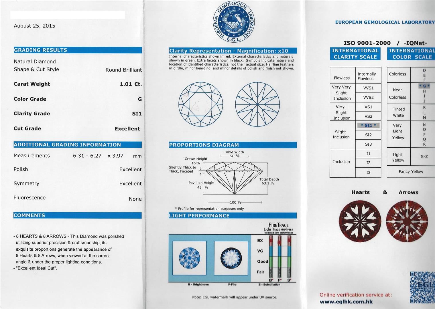 One electronically tested 14KT white gold lady's cast wedding ring with a cathedral split shank with a halo with a bright polish finish. The featured lady's ring has a shank measuring 2.85 millimeters wide. Identified with markings of "14K". Condition is new, good workmanship. Containing: One prong set round brilliant cut diamond, measuring 6.31 - 6.27 x 3.97mm (depth est.) approximate weight of 1.01ct. EGL Laboratory Report #1502124217. Clarity: SI-1. Color: G. Cut Excellent Thirty-Eight prong set round brilliant cut diamonds, measuring 1.25 - 1.20 x 0.77mm (depth est.) approximate total weight of 38 Stones = 0.27ct. Graded in the setting. Clarity: SI-1 to SI-2. Color: G - I. Cut Good. Total Weight of Diamonds 1.28ct. Total Weight of Ring 6.00gm. GAS Appraised at $17,800.00.