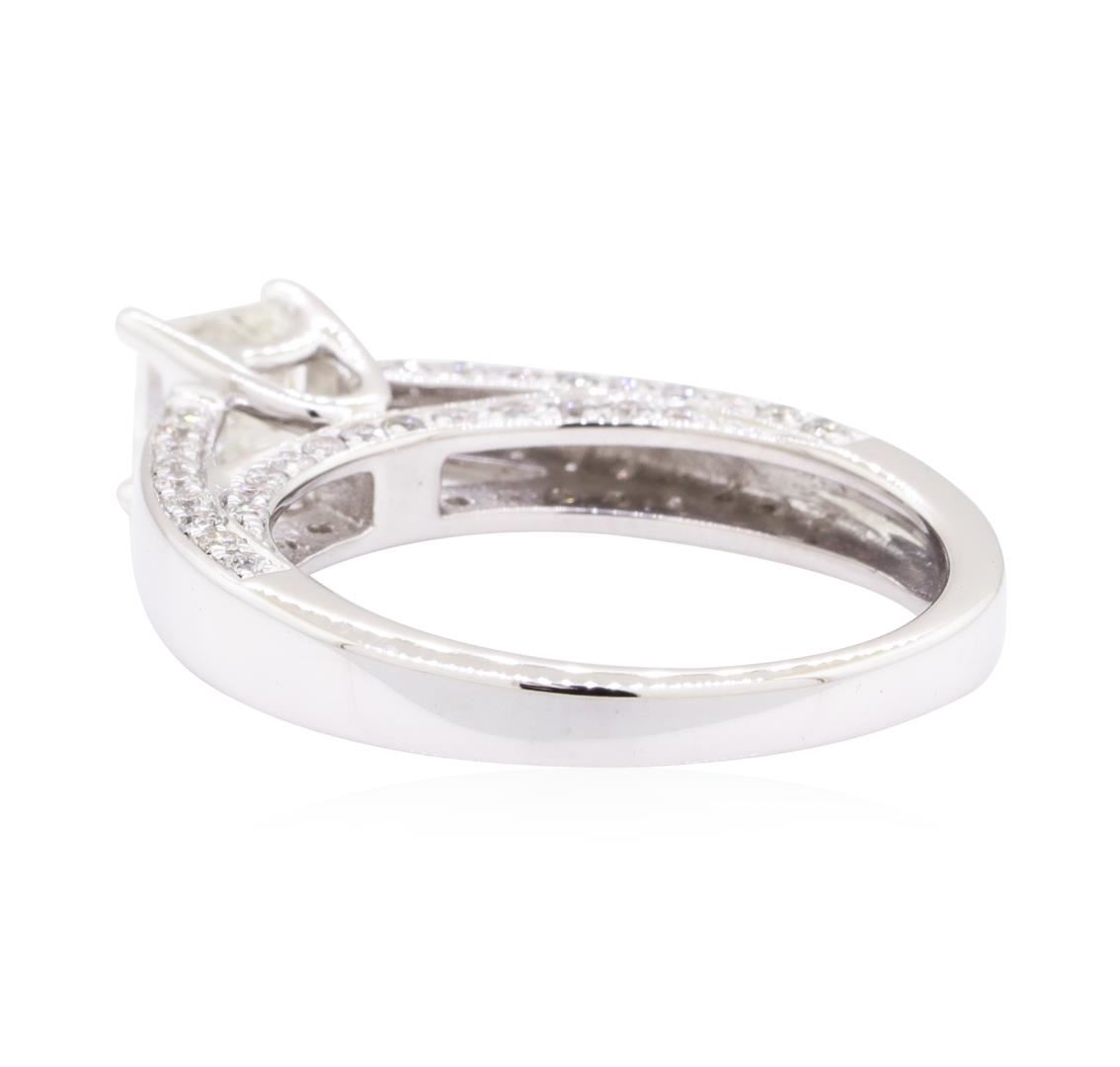 One electronically tested 14KT white gold lady's cast solitaire engagement ring with a cathedral shank with a bright polish finish. The featured lady's ring has a shank measuring 2.50 millimeters wide. Identified with markings of '14K'. Condition is new, good workmanship. Containing: One prong set princess cut diamond, measuring 4.92 x 4.88 x 3.66mm (depth est.) approximate weight of 0.72ct. Graded in the setting. Color H Clarity I-2 Cut Good Sixty bead set round brilliant cut diamonds, measuring 1.40 - 1.30 x 0.84mm (depth est.) approximate total weight of 60 Stones = 0.56ct. Graded in the setting. Color G - H Clarity SI-2 to I-1 Cut Very Good. Total Weight of Diamonds 1.28ct.. Total Weight of Ring 4.80gm GAS Appraised at $4210.00. GAS Appraised at $4,210.00.