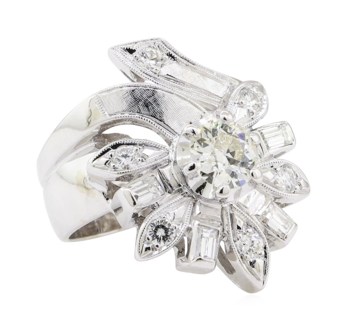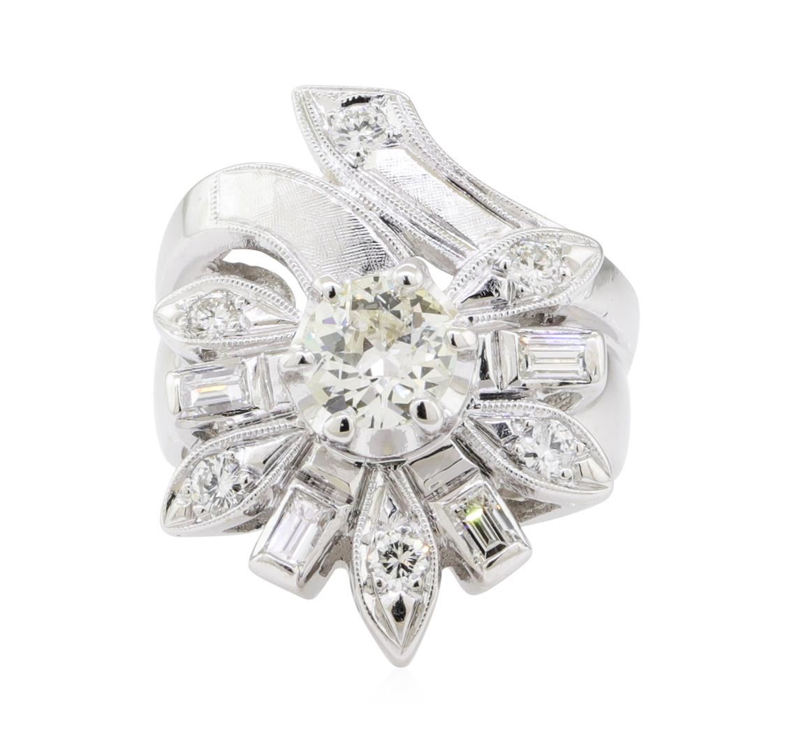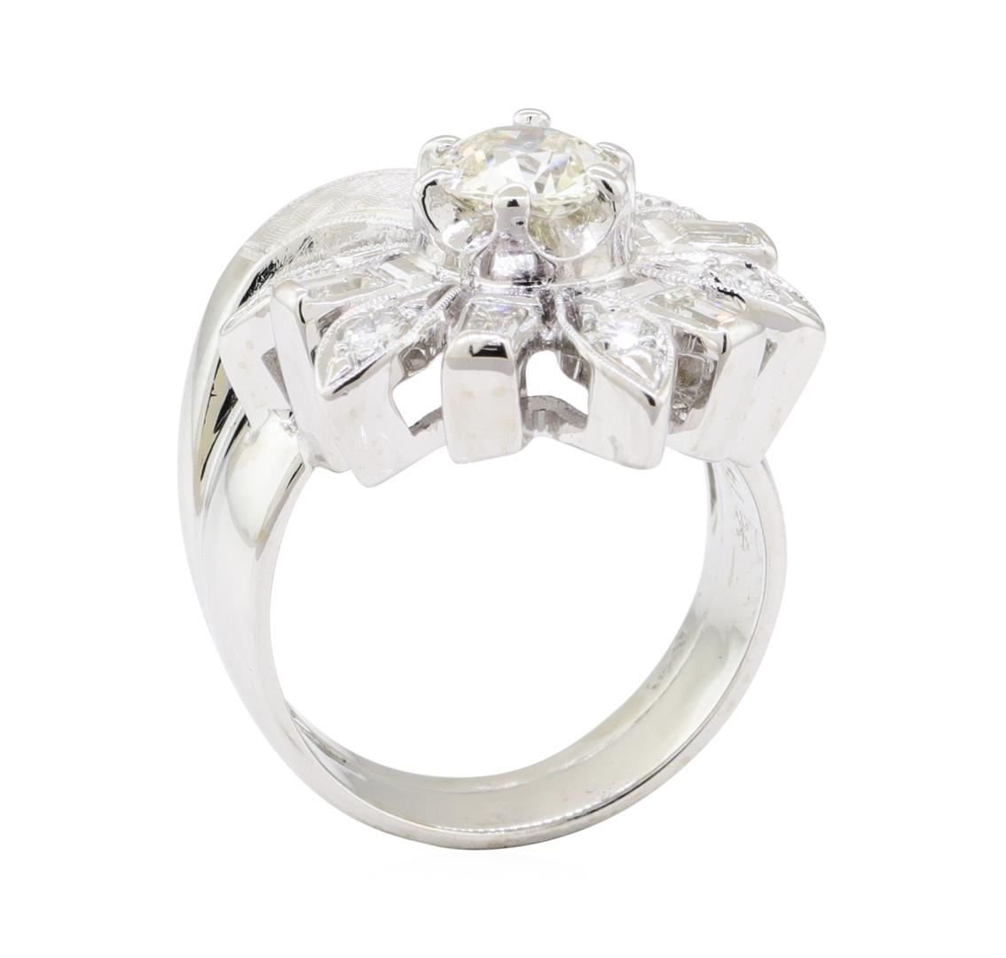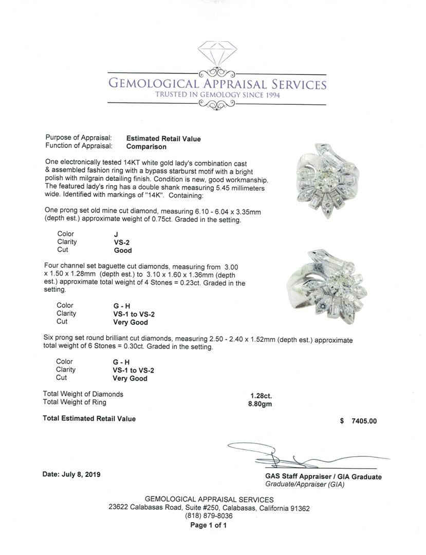 One electronically tested 14KT white gold lady's combination cast & assembled fashion ring with a bypass starburst motif with a bright polish with milgrain detailing finish. The featured lady's ring has a double shank measuring 5.45 millimeters wide. Identified with markings of '14K'. Condition is new, good workmanship. Containing: One prong set old mine cut diamond, measuring 6.10 - 6.04 x 3.35mm (depth est.) approximate weight of 0.75ct. Graded in the setting. Color J Clarity VS-2 Cut Good Four channel set baguette cut diamonds, measuring from 3.00 x 1.50 x 1.28mm (depth est.) to 3.10 x 1.60 x 1.36mm (depth est.) approximate total weight of 4 Stones = 0.23ct. Graded in the setting. Color G - H Clarity VS-1 to VS-2 Cut Very Good Six prong set round brilliant cut diamonds, measuring 2.50 - 2.40 x 1.52mm (depth est.) approximate total weight of 6 Stones = 0.30ct. Graded in the setting. Color G - H Clarity VS-1 to VS-2 Cut Very Good. Total Weight of Diamonds 1.28ct.. Total Weight of Ring 8.80gm GAS Appraised at $7405.00. GAS Appraised at $7,405.00.