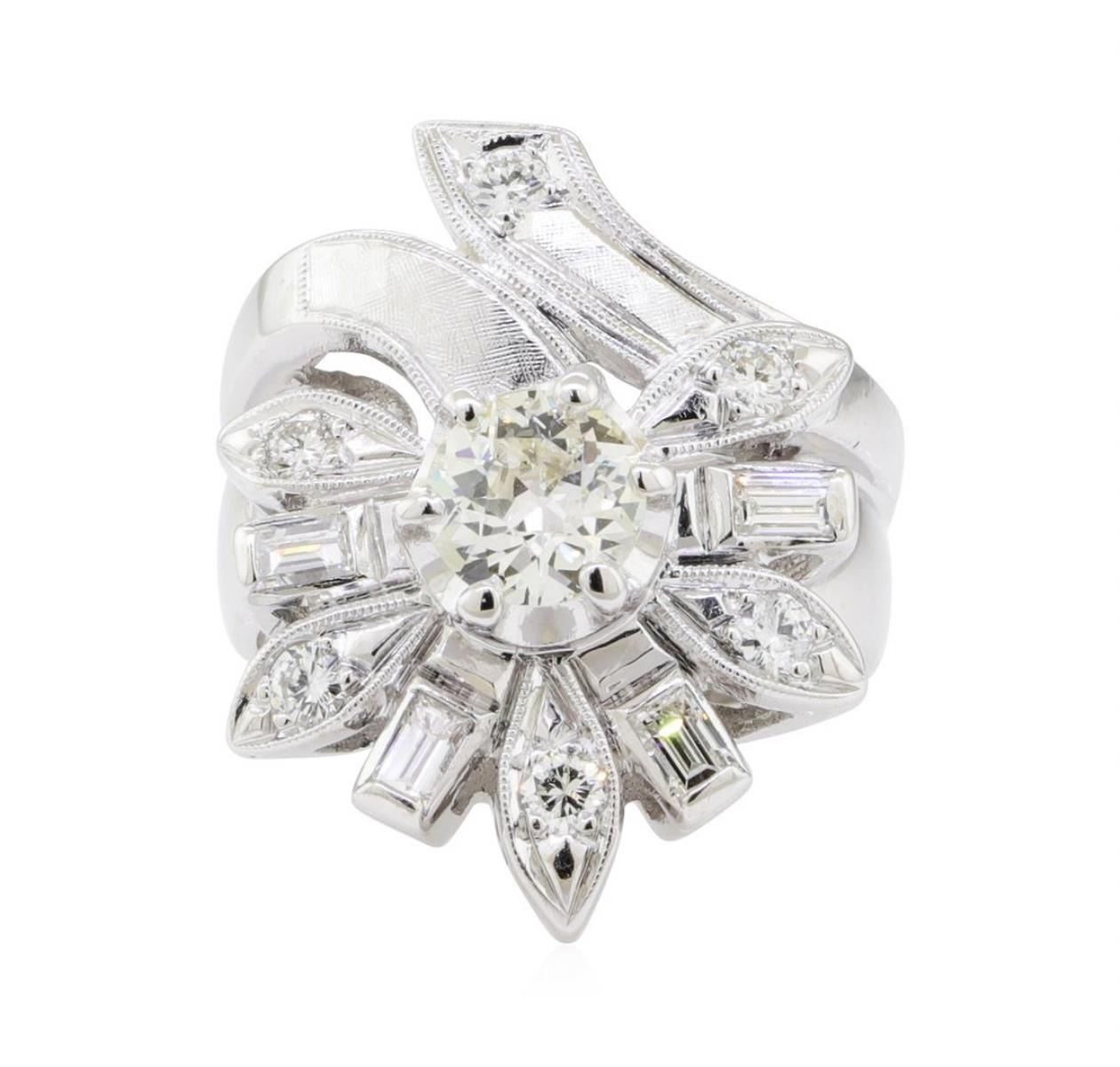 One electronically tested 14KT white gold lady's combination cast & assembled fashion ring with a bypass starburst motif with a bright polish with milgrain detailing finish. The featured lady's ring has a double shank measuring 5.45 millimeters wide. Identified with markings of '14K'. Condition is new, good workmanship. Containing: One prong set old mine cut diamond, measuring 6.10 - 6.04 x 3.35mm (depth est.) approximate weight of 0.75ct. Graded in the setting. Color J Clarity VS-2 Cut Good Four channel set baguette cut diamonds, measuring from 3.00 x 1.50 x 1.28mm (depth est.) to 3.10 x 1.60 x 1.36mm (depth est.) approximate total weight of 4 Stones = 0.23ct. Graded in the setting. Color G - H Clarity VS-1 to VS-2 Cut Very Good Six prong set round brilliant cut diamonds, measuring 2.50 - 2.40 x 1.52mm (depth est.) approximate total weight of 6 Stones = 0.30ct. Graded in the setting. Color G - H Clarity VS-1 to VS-2 Cut Very Good. Total Weight of Diamonds 1.28ct.. Total Weight of Ring 8.80gm GAS Appraised at $7405.00. GAS Appraised.