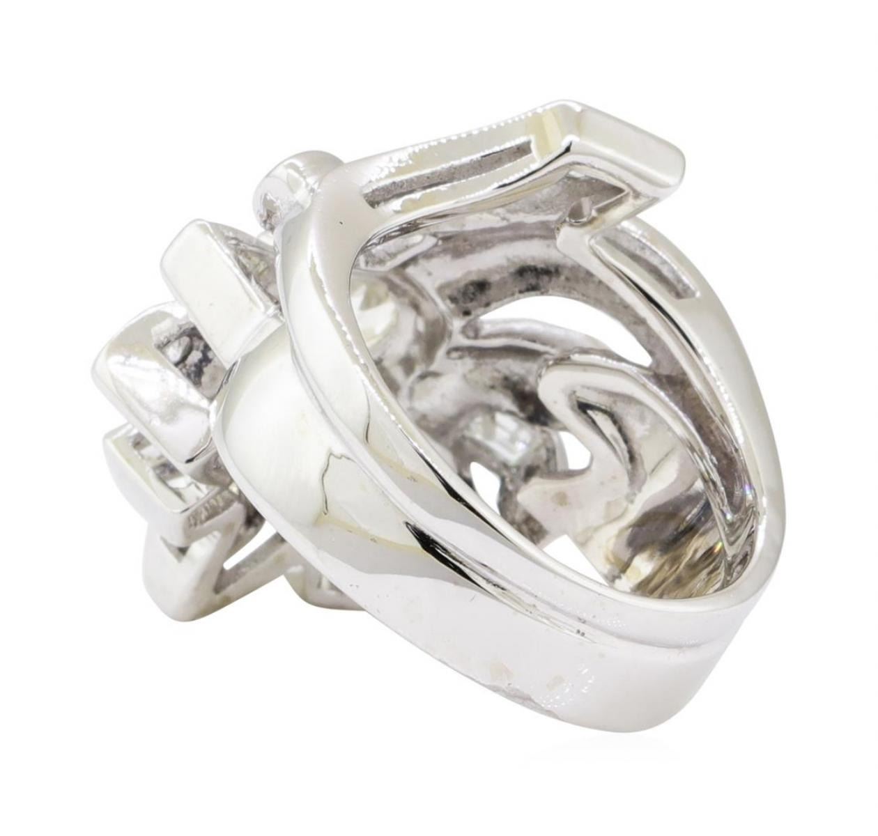 One electronically tested 14KT white gold lady's combination cast & assembled fashion ring with a bypass starburst motif with a bright polish with milgrain detailing finish. The featured lady's ring has a double shank measuring 5.45 millimeters wide. Identified with markings of '14K'. Condition is new, good workmanship. Containing: One prong set old mine cut diamond, measuring 6.10 - 6.04 x 3.35mm (depth est.) approximate weight of 0.75ct. Graded in the setting. Color J Clarity VS-2 Cut Good Four channel set baguette cut diamonds, measuring from 3.00 x 1.50 x 1.28mm (depth est.) to 3.10 x 1.60 x 1.36mm (depth est.) approximate total weight of 4 Stones = 0.23ct. Graded in the setting. Color G - H Clarity VS-1 to VS-2 Cut Very Good Six prong set round brilliant cut diamonds, measuring 2.50 - 2.40 x 1.52mm (depth est.) approximate total weight of 6 Stones = 0.30ct. Graded in the setting. Color G - H Clarity VS-1 to VS-2 Cut Very Good. Total Weight of Diamonds 1.28ct.. Total Weight of Ring 8.80gm GAS Appraised at $7405.00. GAS Appraised.