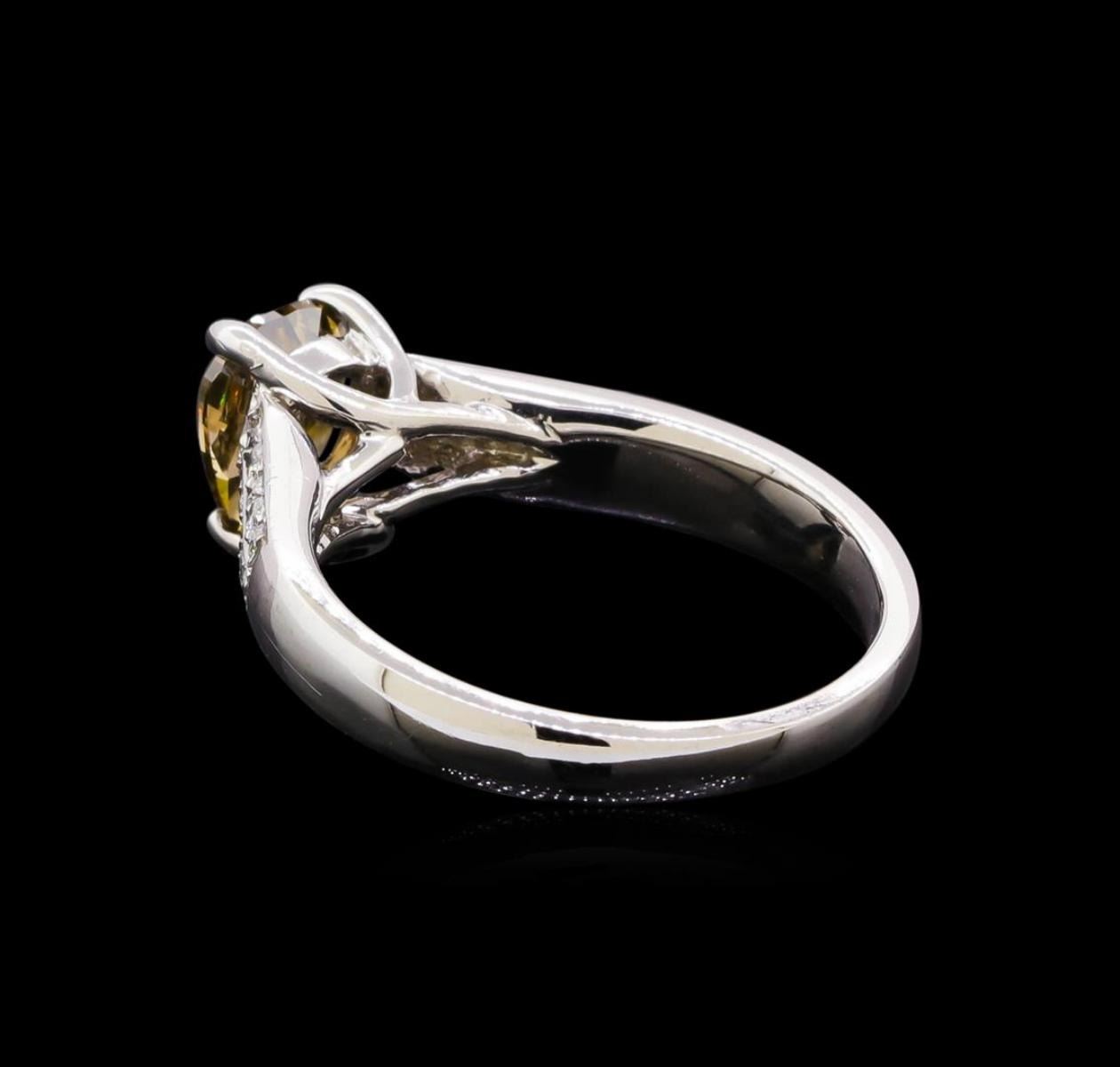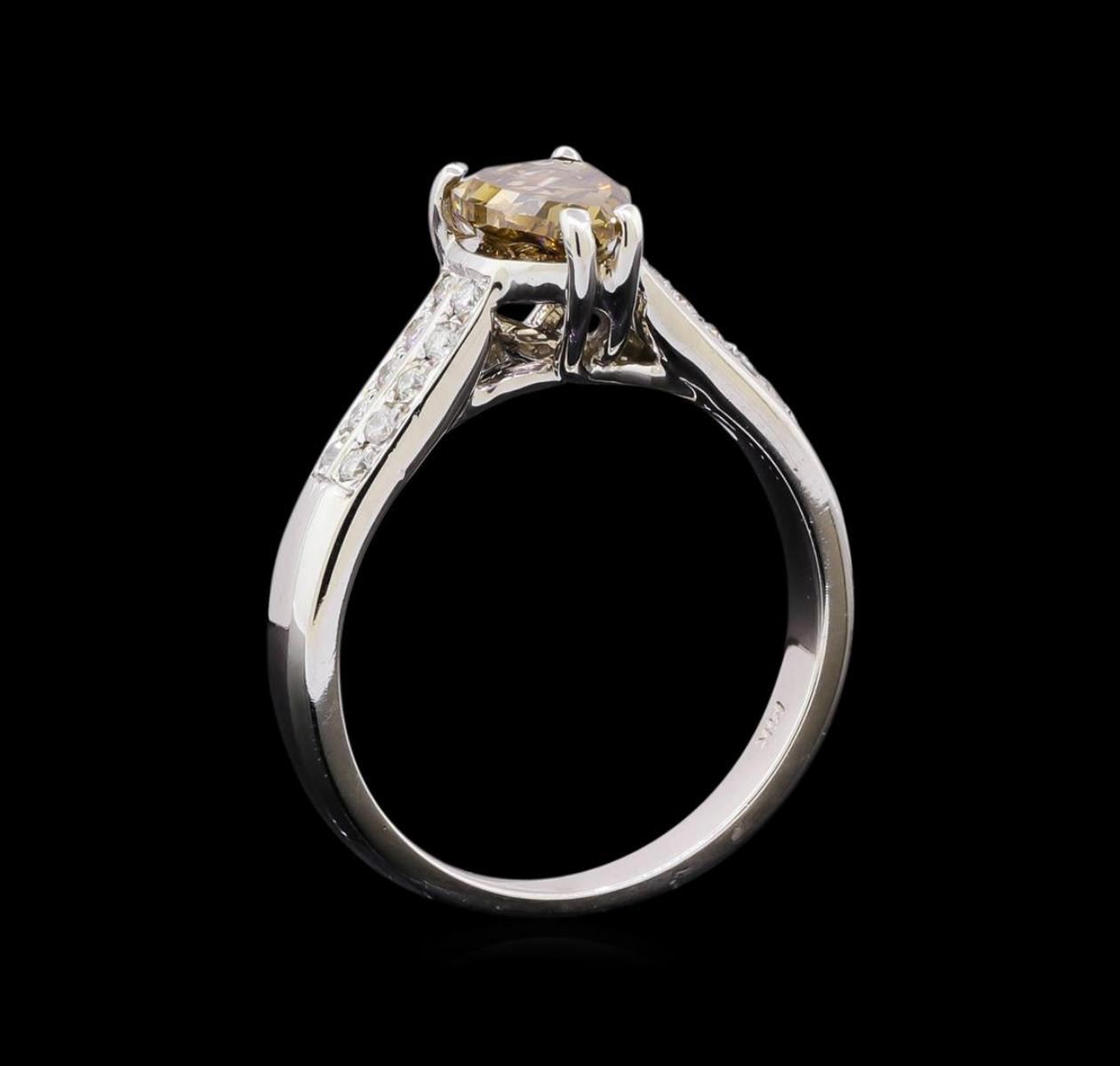 One electronically tested 14KT white gold lady's cast fashion ring with a cathedral shank with a bright polish finish. Featured lady's ring has a shank measuring 4.60 millimeters in width. Identified with markings of "14K". Condition is new, good workmanship. Containing: One prong set pear shaped cut diamond, measuring 8.32 x 5.68 x 3.75mm (depth est.) approximate weight of 1.08ct. Colored gemstones are presumed to have been subjected to commonly used enhancement processes. Graded in the setting. Clarity: VS-2 Cut Good Twenty bead set round brilliant cut diamonds, measuring 1.40 - 1.30 x 0.81mm (depth est.) approximate total weight of 20 Stones = 0.20ct. Graded in the setting. Clarity: SI-1 to SI-2. Color: G - Good. Total Weight of Diamonds 1.28ct. Total Weight of Ring 4.50gm. GAS Appraised.