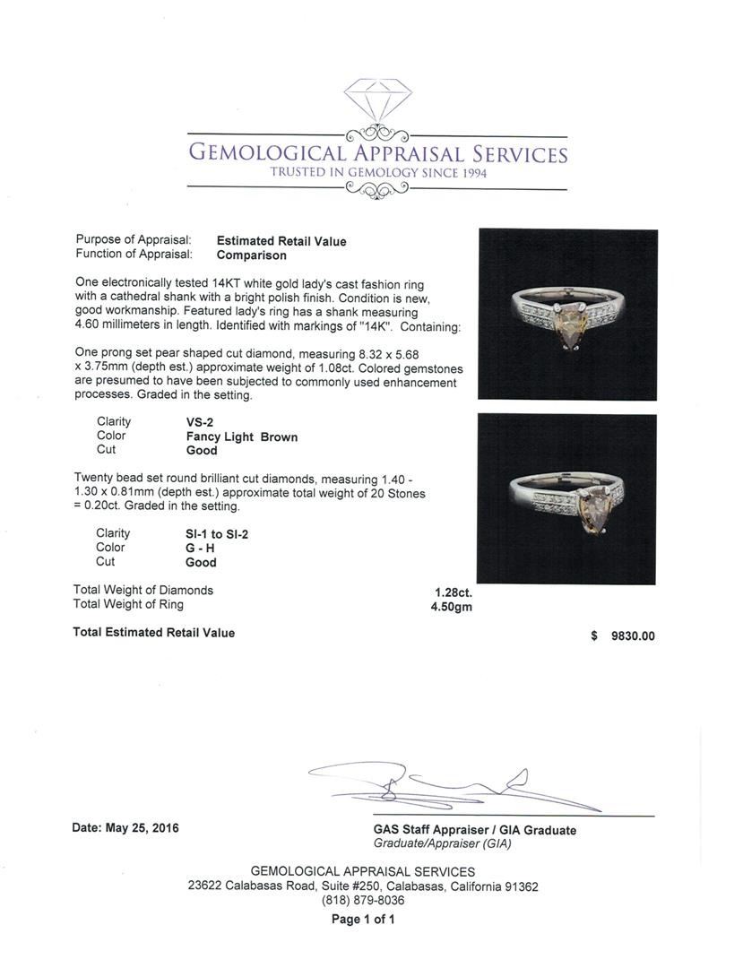 One electronically tested 14KT white gold lady's cast fashion ring with a cathedral shank with a bright polish finish. Featured lady's ring has a shank measuring 4.60 millimeters in width. Identified with markings of "14K". Condition is new, good workmanship. Containing: One prong set pear shaped cut diamond, measuring 8.32 x 5.68 x 3.75mm (depth est.) approximate weight of 1.08ct. Colored gemstones are presumed to have been subjected to commonly used enhancement processes. Graded in the setting. Clarity: VS-2 Cut Good Twenty bead set round brilliant cut diamonds, measuring 1.40 - 1.30 x 0.81mm (depth est.) approximate total weight of 20 Stones = 0.20ct. Graded in the setting. Clarity: SI-1 to SI-2. Color: G - Good. Total Weight of Diamonds 1.28ct. Total Weight of Ring 4.50gm. GAS Appraised.