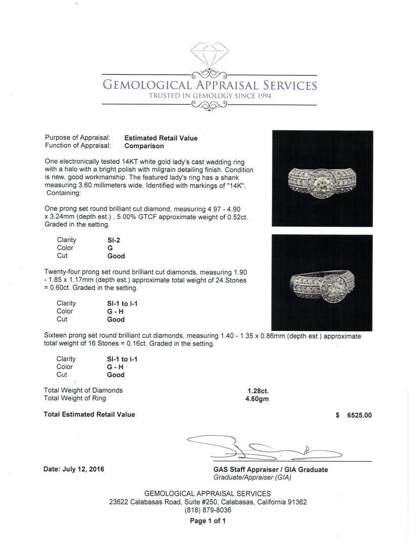 One electronically tested 14KT white gold lady's cast wedding ring with a halo with a bright polish with milgrain detailing finish. The featured lady's ring has a shank measuring 3.60 millimeters wide. Identified with markings of '14K'. Condition is new, good workmanship. Containing: One prong set round brilliant cut diamond, measuring 4.97 - 4.90 x 3.24mm (depth est.) , 5.00.%. GTCF approximate weight of 0.52ct. Graded in the setting. Clarity SI-2. Color: G Cut Good Twenty-Four prong set round brilliant cut diamonds, measuring 1.90 - 1.85 x 1.17mm (depth est.) approximate total weight of 24 Stones = 0.60ct. Graded in the setting. Clarity SI-1 to I-1. Color: G - H Cut Good Sixteen prong set round brilliant cut diamonds, measuring 1.40 - 1.35 x 0.86mm (depth est.) approximate total weight of 16 Stones = 0.16ct. Graded in the setting. Clarity SI-1 to I-1. Color: G - H Cut Good. Total Weight of Diamonds 1.28ct.. Total Weight of Ring 4.60gm. GAS Appraised.