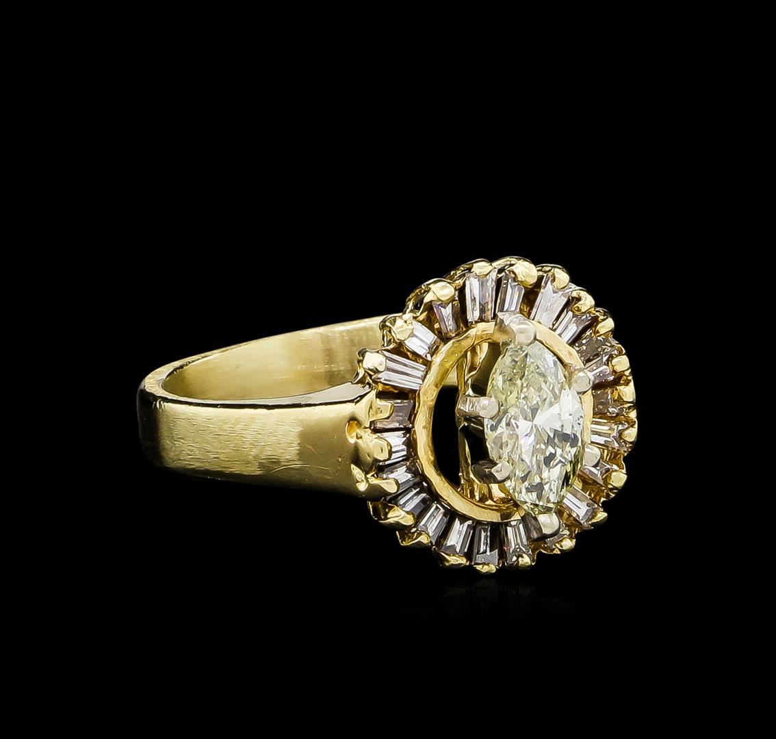 One electronically tested 14KT yellow gold ladies cast & assembled diamond ring. The featured diamond is set within a circular diamond bezel supported by a ribbed under gallery, completed by a three millimeter wide band. Bright polish and satin finish. Identified with markings of "14K". Condition is good. Containing: One prong set marquise shaped cut diamond, measuring 8.10 x 4.50 x 3.20mm (depth est.), 5.00.%. GTCF approximate weight of 0.75ct with a strong blue fluorescence. Graded in the setting. Clarity: SI-2. Color: L. Depth 71.1%. Table 57.8%. Twenty-Two prong set baguette cut (tapered) diamonds, measuring from 2.10 x 1.10 x 0.77mm (depth est.) to 2.40 x 1.40 x 0.98mm (depth est.) approximate total weight of 22 Stones = 0.53ct. Graded in the setting. Clarity: VS-2 to SI-2. Color: I - K. Total Weight of Diamonds 1.28ct. Total Weight of Ring 6.55gm. AIG Appraised at $5,785.00.