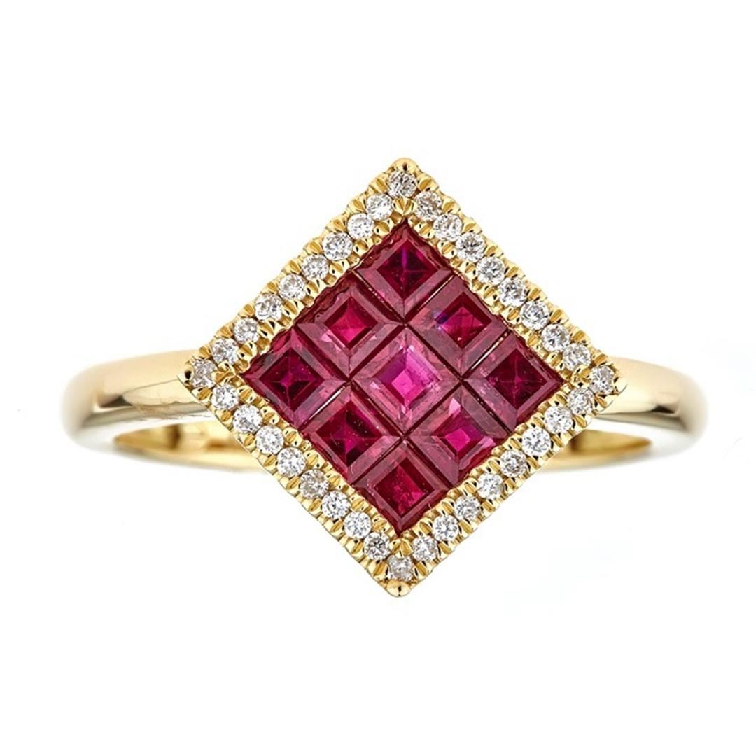 One Ruby and Diamond Ring featuring: 18KT Yellow Gold with a total weight of 3.64 grams, Nine Ruby Stones with a total weight of 1.28ctw,, and 36 Round Cut Diamond with a total weight of 0.14ctw.