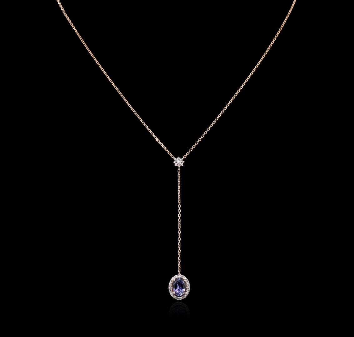 One necklace featuring: 14KT rose gold weighing 3.63 grams containing one tanzanite with a total weight of 1.28ct and diamonds with a total weight of 0.30ct.