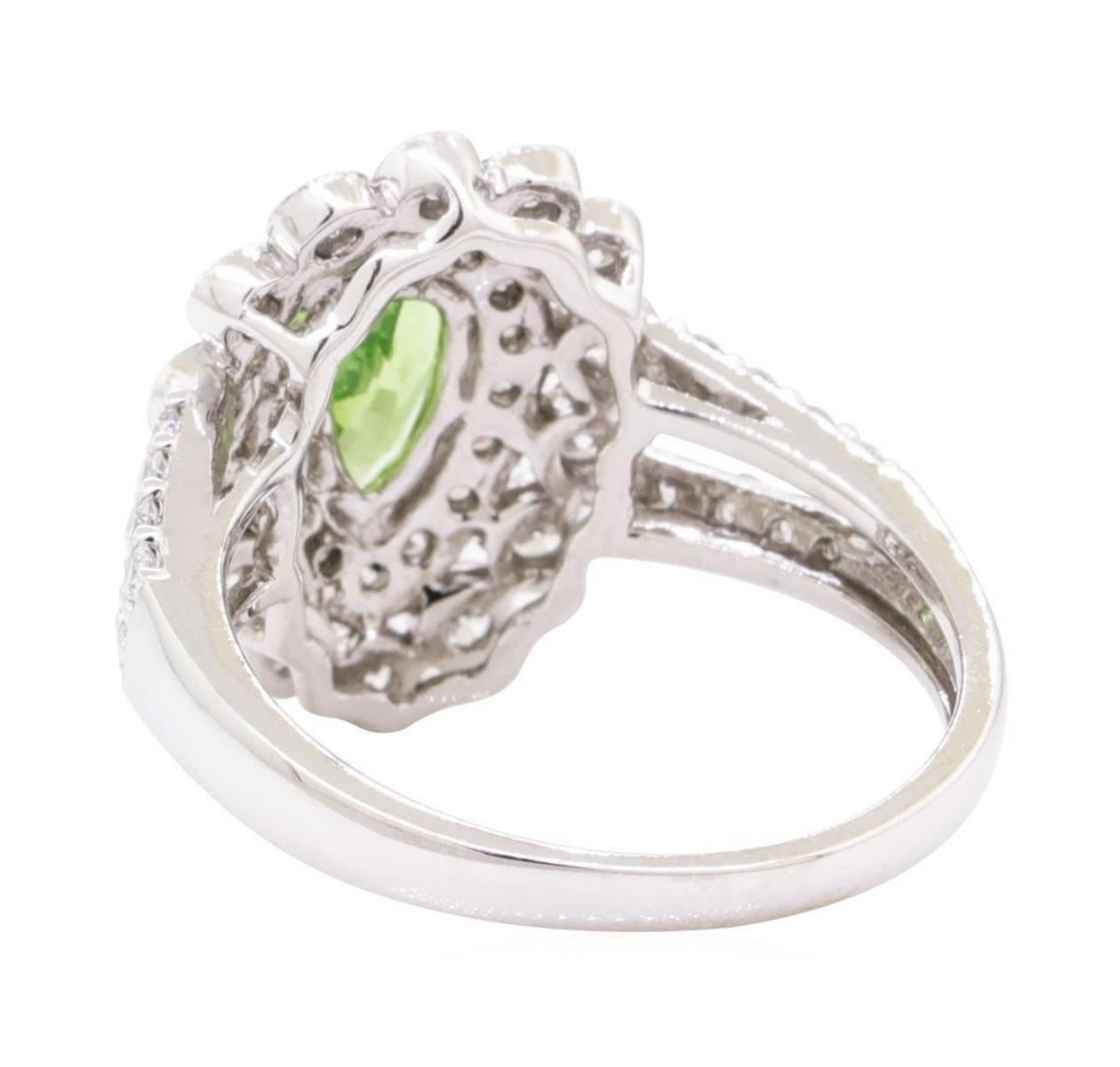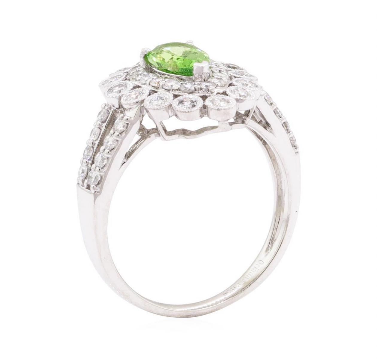 One electronically tested platinum lady's cast fashion ring with a split shank double halo with a bright polish with milgrain detailing finish. The featured lady's ring has a shank measuring 2.00 millimeters wide. Trademark is Orianne. Identified with markings of 'PT 950'. Condition is new, good workmanship. Containing: One prong set pear modified mixed cut natural tsavorite garnet, measuring 8.15 x 5.08 x 3.06mm, (depth est.) approximate weight of 0.88ct., clarity is slightly included, medium, moderately strong, slightly yellowish green color, (GIA slyG 5/4), cut is good. Transmitting light with a minimum of distortion, transparent. Colored gemstones are presumed to have been subjected to commonly used enhancement processes. Graded in the setting. Fourteen bezel set round brilliant cut diamonds, measuring 2.00 - 1.90 x 1.21mm (depth est.) approximate total weight of 14 Stones = 0.40ct. Graded in the setting. Color G - H Clarity SI-1 to SI-2 Cut Very Good Thirty-Two prong set round brilliant cut diamonds, measuring 1.50 - 1.45 x 0.92mm (depth est.) approximate total weight of 32 Stones = 0.42ct. Graded in the setting. Color G - H Clarity SI-1 to SI-2 Cut Very Good. Total Weight of Colored Stones 0.88ct.. Total Weight of Diamonds 0.82ct.. Total Weight of Ring 7.70gm GAS Appraised at $4075.00. GAS Appraised.