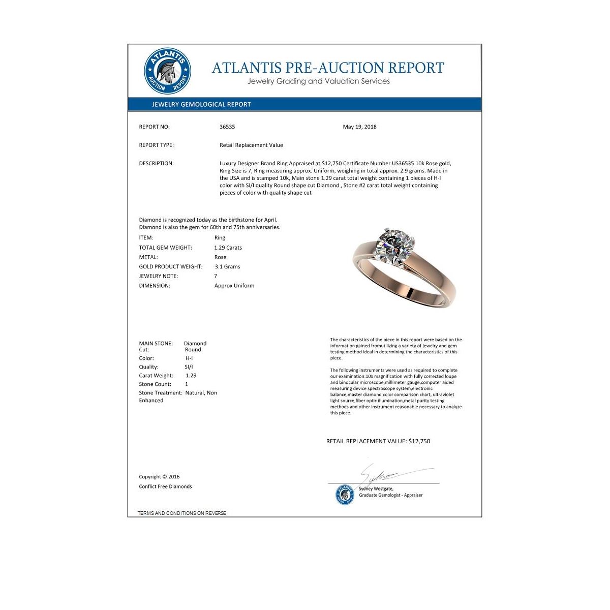 REF-191W3F -36535 ---- 1.29 CTW Certified H-SI/I Quality Diamond Solitaire Engagement Ring 10K Rose Gold ---- Luxury Designer Brand Ring Appraised at $12,750 Certificate Number US36535 10k Rose gold, Ring Size is 7, Ring measuring approx. Uniform, weighing in total approx. 2.9 grams. Made in the USA and is stamped 10k, Main stone 1.29 carat total weight containing 1 pieces of H-I color with SI/I quality Round shape cut Diamond , Stone #2 carat total weight containing pieces of color with quality shape cut