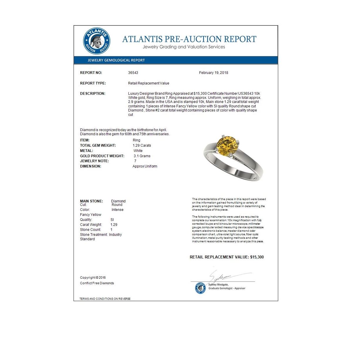 REF-191M3H -36543 ---- 1.29 CTW Certified Intense Yellow SI Diamond Solitaire Ring 10K White Gold ---- Luxury Designer Brand Ring Appraised at $15,300 Certificate Number US36543 10k White gold, Ring Size is 7, Ring measuring approx. Uniform, weighing in total approx. 2.9 grams. Made in the USA and is stamped 10k, Main stone 1.29 carat total weight containing 1 pieces of Intense Fancy Yellow color with SI quality Round shape cut Diamond , Stone #2 carat total weight containing pieces of color with quality shape cut