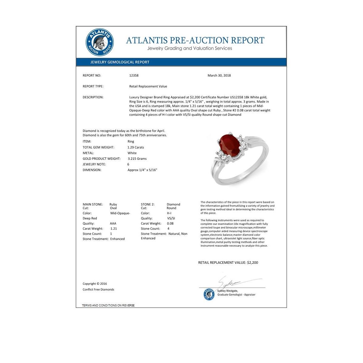 REF-33A5X -12358 ---- 1.29 CTW Ruby & Diamond Ring 18K White Gold ---- Luxury Designer Brand Ring Appraised at $2,200 Certificate Number US12358 18k White gold, Ring Size is 6, Ring measuring approx. 1/4" x 5/16" , weighing in total approx. 3 grams. Made in the USA and is stamped 18k, Main stone 1.21 carat total weight containing 1 pieces of Mid-Opaque-Deep Red color with AAA quality Oval shape cut Ruby , Stone #2 0.08 carat total weight containing 4 pieces of H-I color with VS/SI quality Round shape cut Diamond
