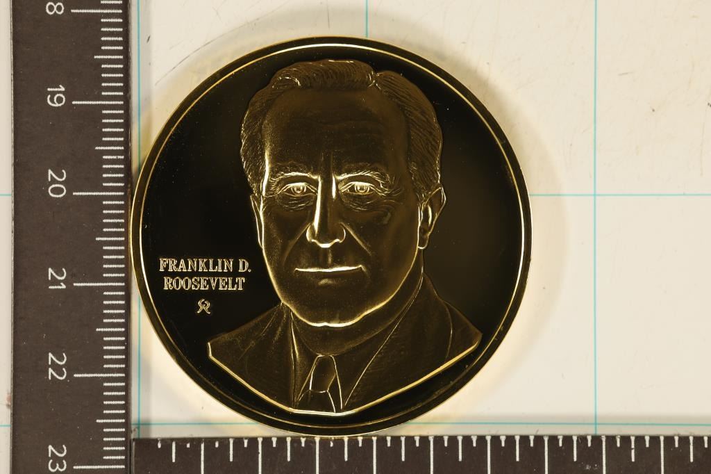 PROOF PRESIDENTIAL ROUND, FRANKLIN R. ROOSEVELT, IN HARD PLASTIC CAPSULE, EDGE MARKED OFFICIAL WHITE HOUSE HISTORICAL ASSOCIATION