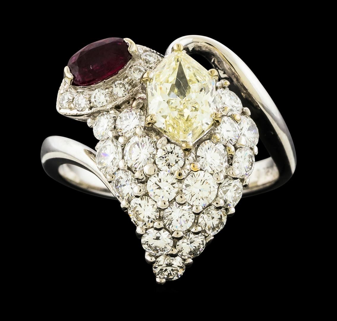 One ring featuring: Platinum containing Diamonds with a total weight of 1.29ct, Diamonds with a total weight of 1.02ct, and Ruby with a total weight of 0.36ct. Total Weight of Ring: 7.1 grams.