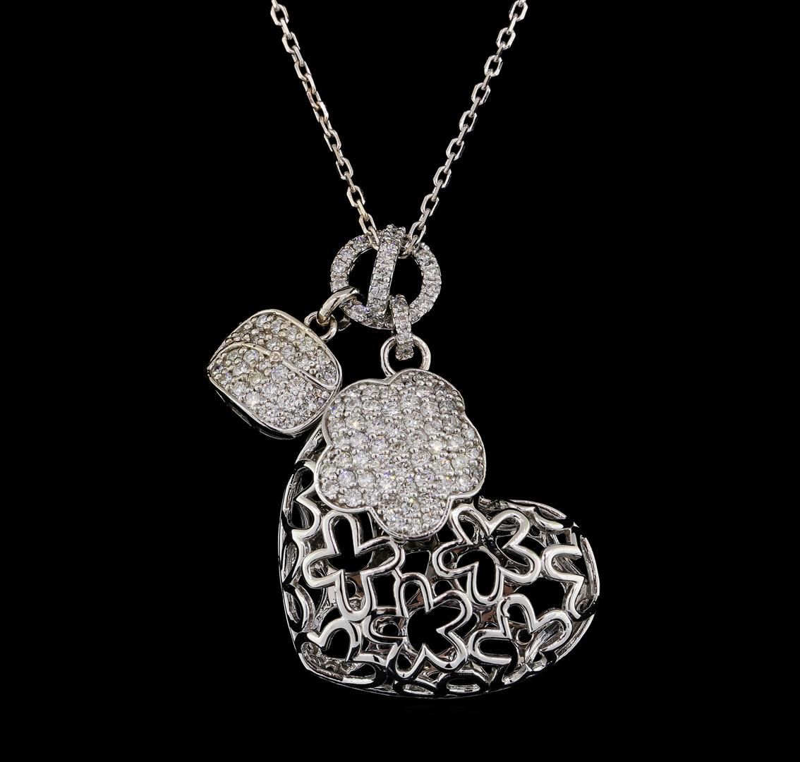 One electronically tested 14KT white gold lady's combination cast & assembled heart shape pendant & chain 16.0' long, 1.2mm diamond cut cable link with a lobster claw clasp with a bright polish finish. The featured lady's pendant has a puffed heart shaped motif composed of floral designs. Identified with markings of '14K'. Condition is new, good workmanship. Containing: Eighty-Three prong set round brilliant cut diamonds, measuring 1.50 - 1.45 x 0.92mm (depth est.) approximate total weight of 83 Stones = 1.02ct. Graded in the setting. Clarity SI-1 to SI-2. Color: H - I Cut Good Twenty-Nine prong set round brilliant cut diamonds, measuring 1.40 - 1.30 x 0.84mm (depth est.) approximate total weight of 29 Stones = 0.27ct. Graded in the setting. Clarity SI-1 to SI-2. Color: H - I Cut Good. Total Weight of Diamonds 1.29ct.. Total Weight of Pendant & Chain 10.50gm. GAS Appraised at $5,360.00.