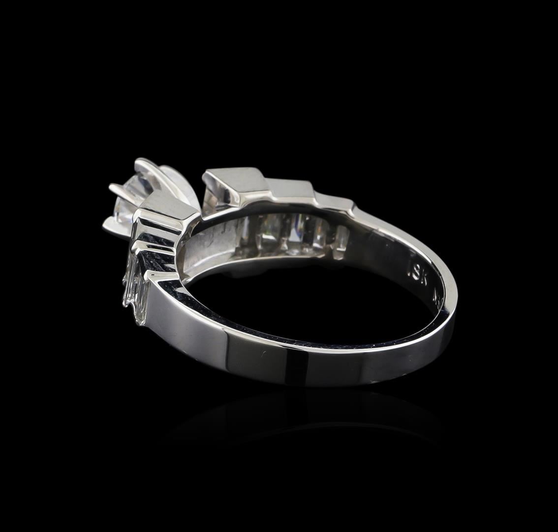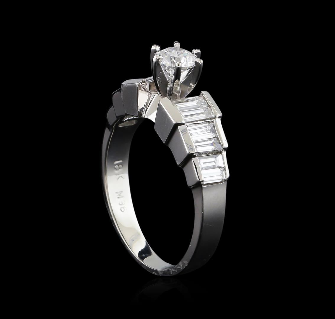 One electronically tested 18KT white gold lady's cast wedding ring with a bright polish finish. The featured lady's ring has a shank measuring 2.55 millimeters wide. Identified with markings of "18K". Condition is new, good workmanship. Containing: One prong set round brilliant cut diamond, measuring 4.58 - 4.53 x 2.87mm (depth est.) approximate weight of 0.36ct. Graded in the setting. Clarity: VS-2. Color: Very Good Four channel set baguette cut diamonds, measuring from 4.45 x 1.60 x 1.36mm (depth est.) to 4.50 x 1.70 x 1.45mm (depth est.) approximate total weight of 4 Stones = 0.38ct. Graded in the setting. Clarity: VS-1 to VS-2. Color: H - I. Cut Very Good Four channel set baguette cut diamonds, measuring from 3.80 x 1.50 x 1.28mm (depth est.) to 3.85 x 1.60 x 1.36mm (depth est.) approximate total weight of 4 Stones = 0.30ct. Graded in the setting. Clarity: VS-1 to VS-2. Color: H - I. Cut Very Good Four channel set baguette cut diamonds, measuring from 3.25 x 1.50 x 1.28mm (depth est.) to 3.30 x 1.60 x 1.36mm (depth est.) approximate total weight of 4 Stones = 0.25ct. Graded in the setting. Clarity: VS-1 to VS-2. Color: G - Very Good. Total Weight of Diamonds 1.29ct. Total Weight of Ring 4.90gm. GAS Appraised at $6,165.00.