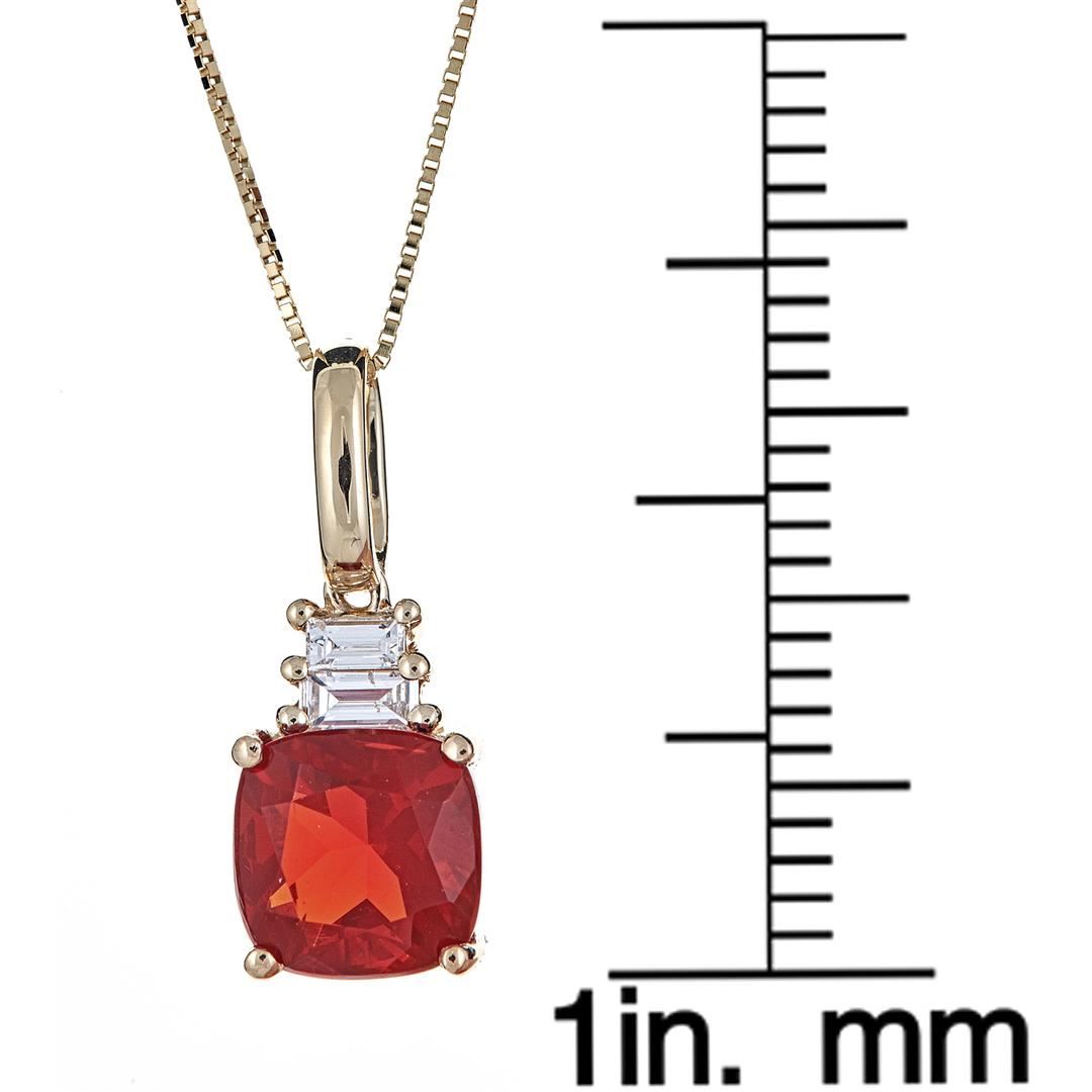 One pendant with chain featuring: 14KT yellow gold weighing 0.97 grams containing one cushion cut fire opal with a total weight of 1.29 ct and diamonds weighing a total of 0.12 ctw.