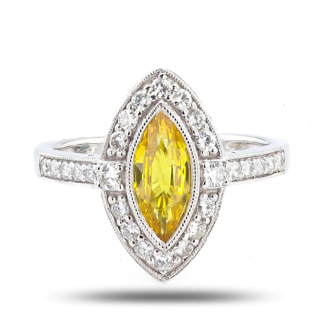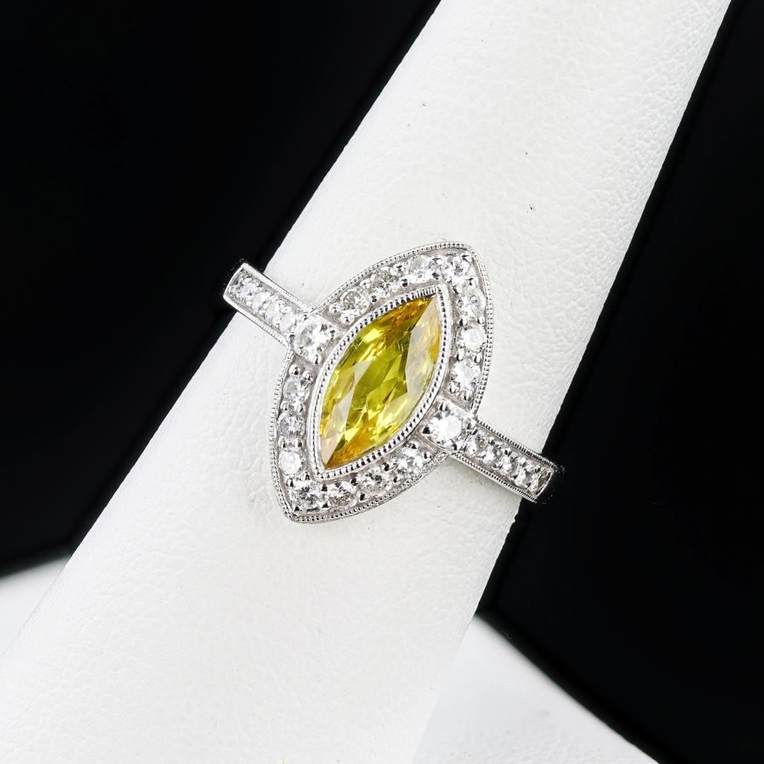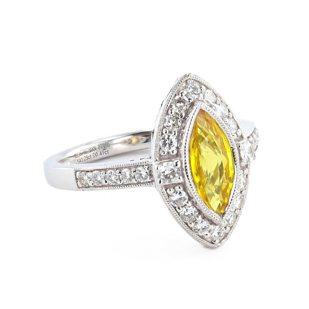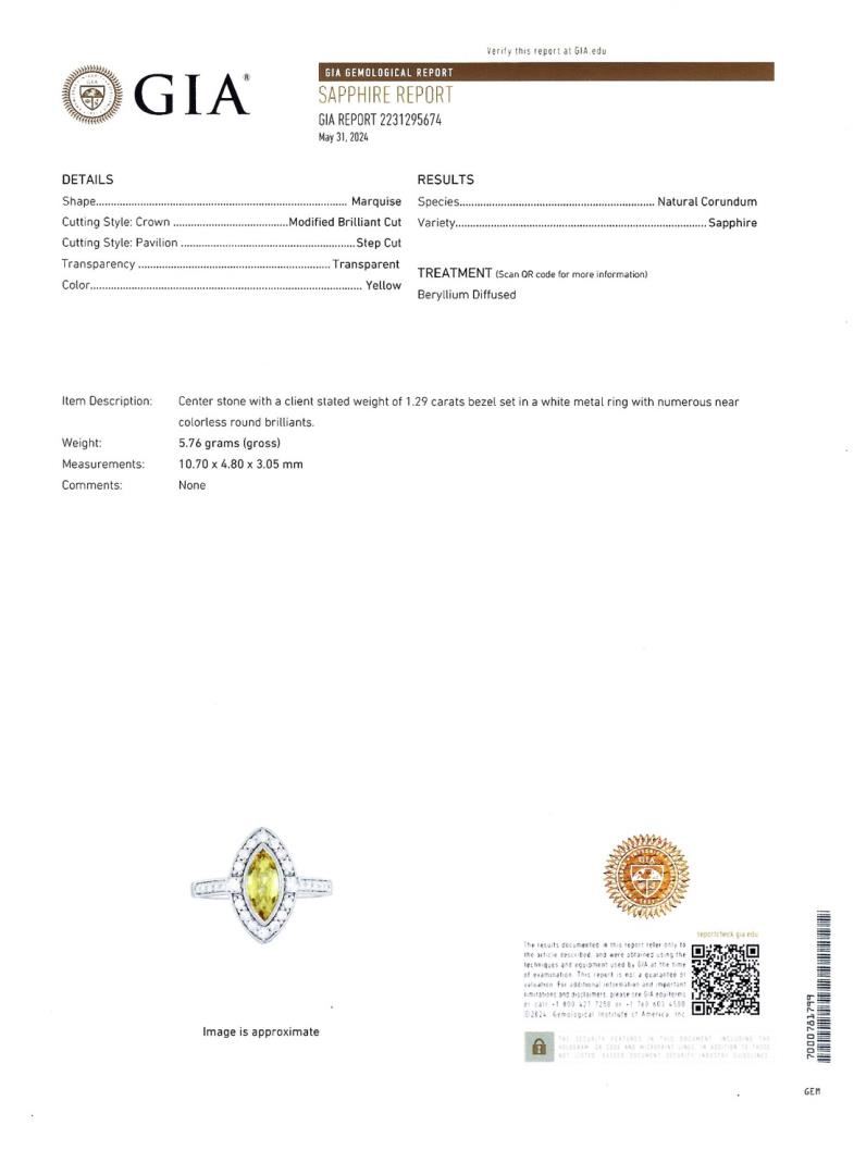 One polished, stamped, and tested platinum ring marked Oscar Friedman. The ring is mounted with: 1 genuine GIA certified sapphire center stone weighing approximately 1.29 carats, and 26 genuine round diamonds weighing approximately 0.41 carats. This item weighs 5.7 grams, condition is new, excellent workmanship. #MAIN GEMSTONE# GIA Report No.: 2231295674 Species: Natural Corundum Variety: Sapphire Shape: Marquise Cutting Style: Modified Brilliant Cut Crown, Step Cut Pavilion Measurements: 10.70 x 4.80 x 3.05mm Weight: 1.29 carats Color: Yellow Transparency: Transparent Treatment: Beryllium Diffusion Refractive Index: 1.762 - 1.770 DR Birefringence: 0.008 - 0.010 Hardness: 9 #ADJACENT GEMSTONES ON RING# Identity: Natural Diamond Shape: Round Cutting Style: Brilliant Cut Quantity: 26 Diamonds Measurements: 1.5 - 2.0mm Total Weight: 0.41 carats Clarity Grade: VS2-SI1 Color Grade: F-G Refractive Index: 2.417 Hardness: 10 SAPPHIRE WEIGHT: 1.29 ct TOTAL DIAMOND WEIGHT: 0.41 cts WEIGHT OF ITEM: 5.7 grams METAL: Platinum Size: 6 3/4
