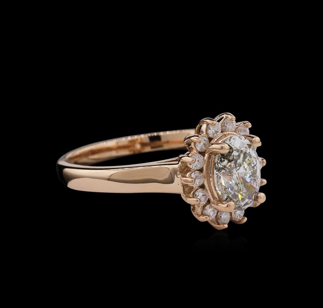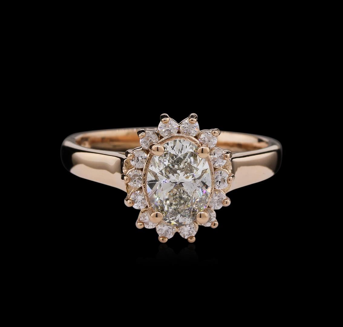 One electronically tested 14KT rose gold lady's cast wedding ring with a basket halo with a bright polish finish. The featured lady's ring has a shank measuring 2.16 millimeters wide. Identified with markings of "14K". Condition is new, good workmanship. Containing: One prong set oval shaped cut diamond, measuring 7.67 x 5.66 x 3.79mm (depth est.) approximate weight of 1.04ct. Graded in the setting. Clarity: I-1. Color: K - Very Good Fourteen prong set round brilliant cut diamonds, measuring 1.70 - 1.60 x 1.06mm (depth est.) approximate total weight of 14 Stones = 0.25ct. Graded in the setting. Clarity: SI-1 to I-1. Color: H - I. Cut Good. Total Weight of Diamonds 1.29ct. Total Weight of Ring 4.20gm. GAS Appraised at $6,655.00.