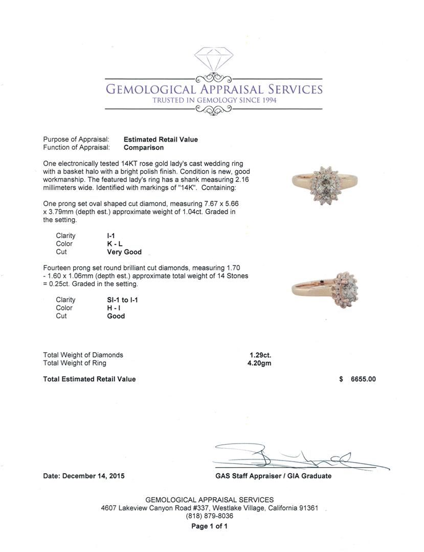 One electronically tested 14KT rose gold lady's cast wedding ring with a basket halo with a bright polish finish. The featured lady's ring has a shank measuring 2.16 millimeters wide. Identified with markings of "14K". Condition is new, good workmanship. Containing: One prong set oval shaped cut diamond, measuring 7.67 x 5.66 x 3.79mm (depth est.) approximate weight of 1.04ct. Graded in the setting. Clarity: I-1. Color: K - Very Good Fourteen prong set round brilliant cut diamonds, measuring 1.70 - 1.60 x 1.06mm (depth est.) approximate total weight of 14 Stones = 0.25ct. Graded in the setting. Clarity: SI-1 to I-1. Color: H - I. Cut Good. Total Weight of Diamonds 1.29ct. Total Weight of Ring 4.20gm. GAS Appraised at $6,655.00.