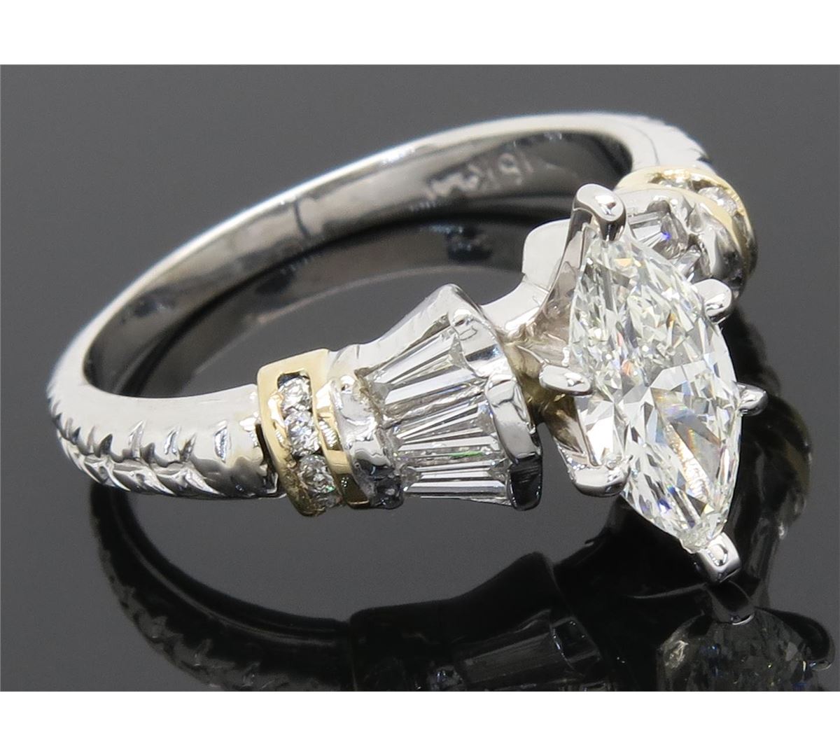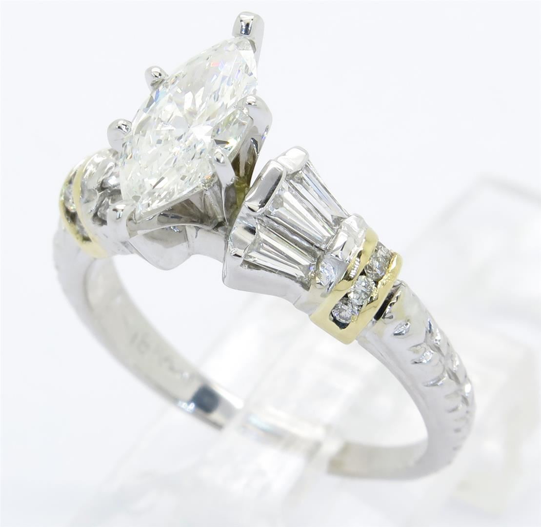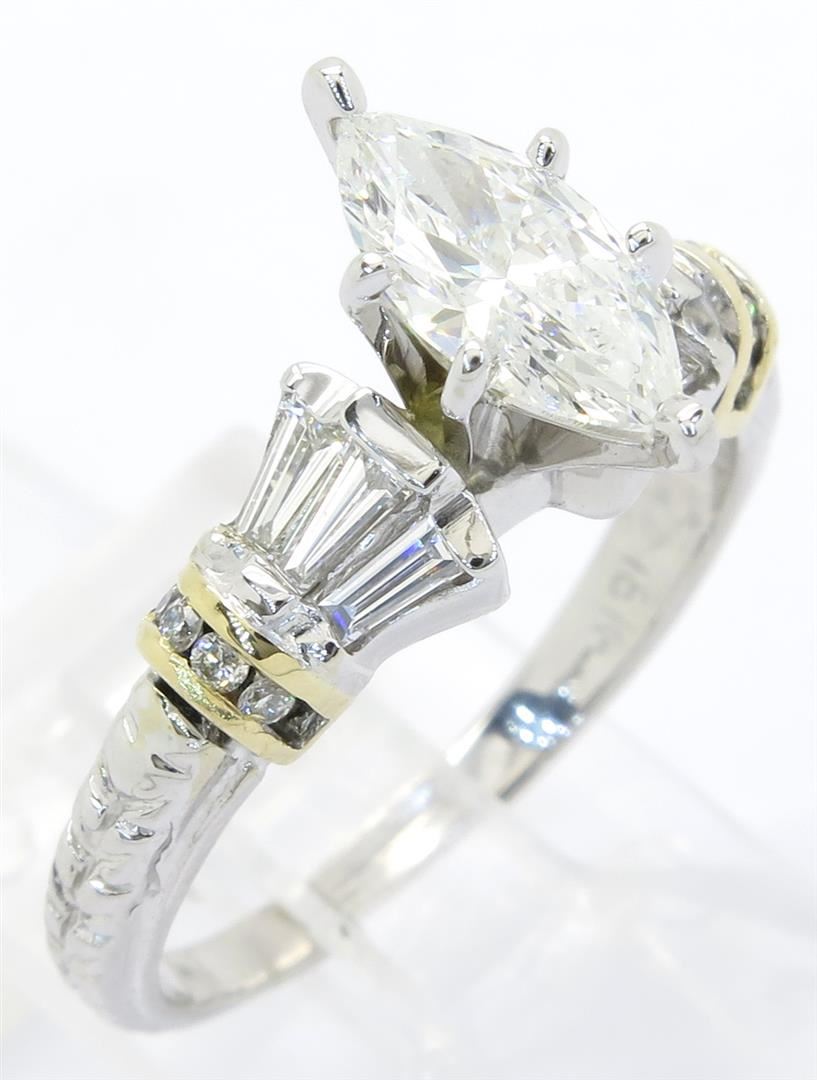 One tested 18K two tone gold diamond ring. Containing: One Marquise Cut Diamond set in a platinum head. Approximate weight: .79CT, Clarity: SI2, Color: J. 10 Round Brilliant Cut Diamonds, 6 Baguette Cut Diamonds. Approximate total diamond weight: 1.29CTW. Diamonds are graded in the mounting, unless otherwise stated. Weight of ring: 5.1 grams. Size: 6.75.