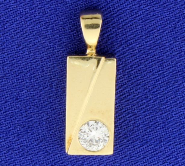 In 14K yellow gold this pendant has a great facing 1/2ct diamond that is I1 clarity/G color. Fantastic cut, lots of sparkle! The pendant is 7/8 inch long. 4.1g