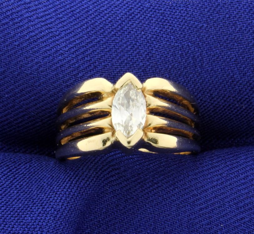 In 14K yellow gold, the 1/2ct marquise diamond is H color/SI2 clarity. Size 6 3/4 7.6g