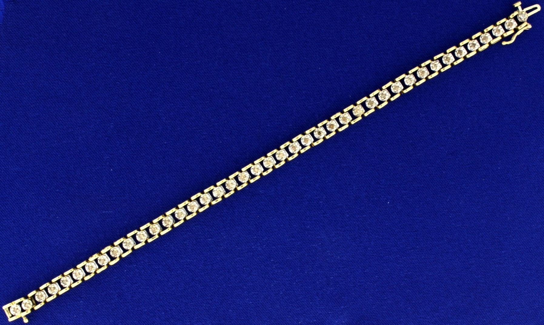In 10k yellow and white gold. Contains forty one high quality champagne diamonds with warm color and excellent clarity. 7 1/2" long with safety clasp. 10.0g.