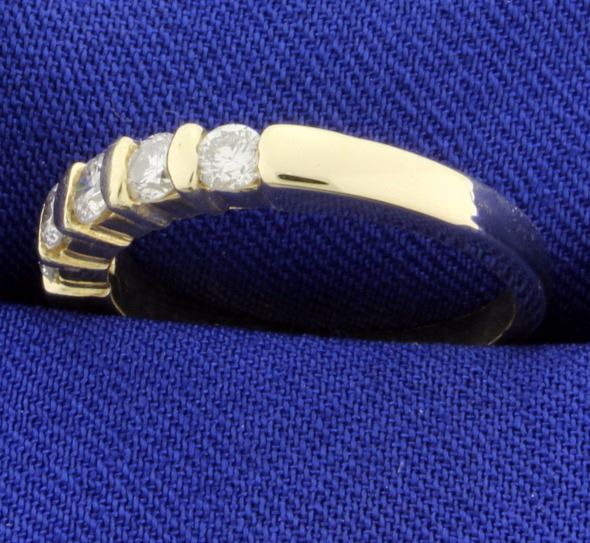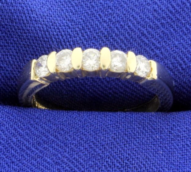 In 14K yellow gold, this ring contains five high quality .1ct round diamonds SI clarity/G color. Size 6 1/2 3.6g