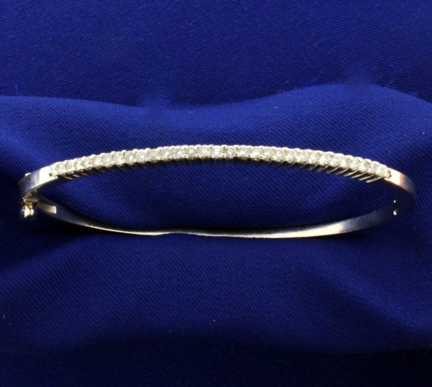 In 14k white gold, contains 1/2ct of high quality round brilliant diamonds of SI clarity/H color. 2 3/8" inside diameter- hinges open for easy put on/take off, with safety clasp. 12.6g.