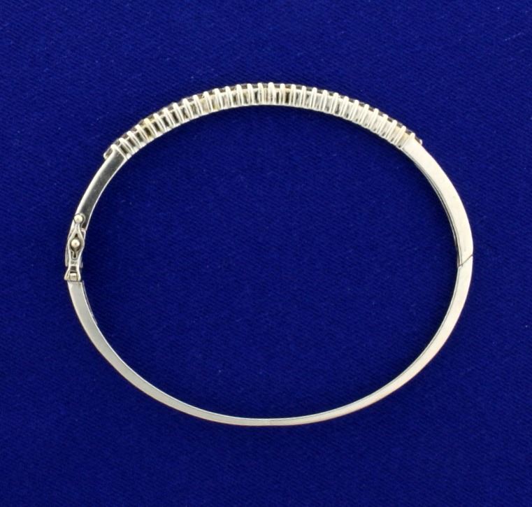 In 14k white gold, contains 1/2ct of high quality round brilliant diamonds of SI clarity/H color. 2 3/8" inside diameter- hinges open for easy put on/take off, with safety clasp. 12.6g.