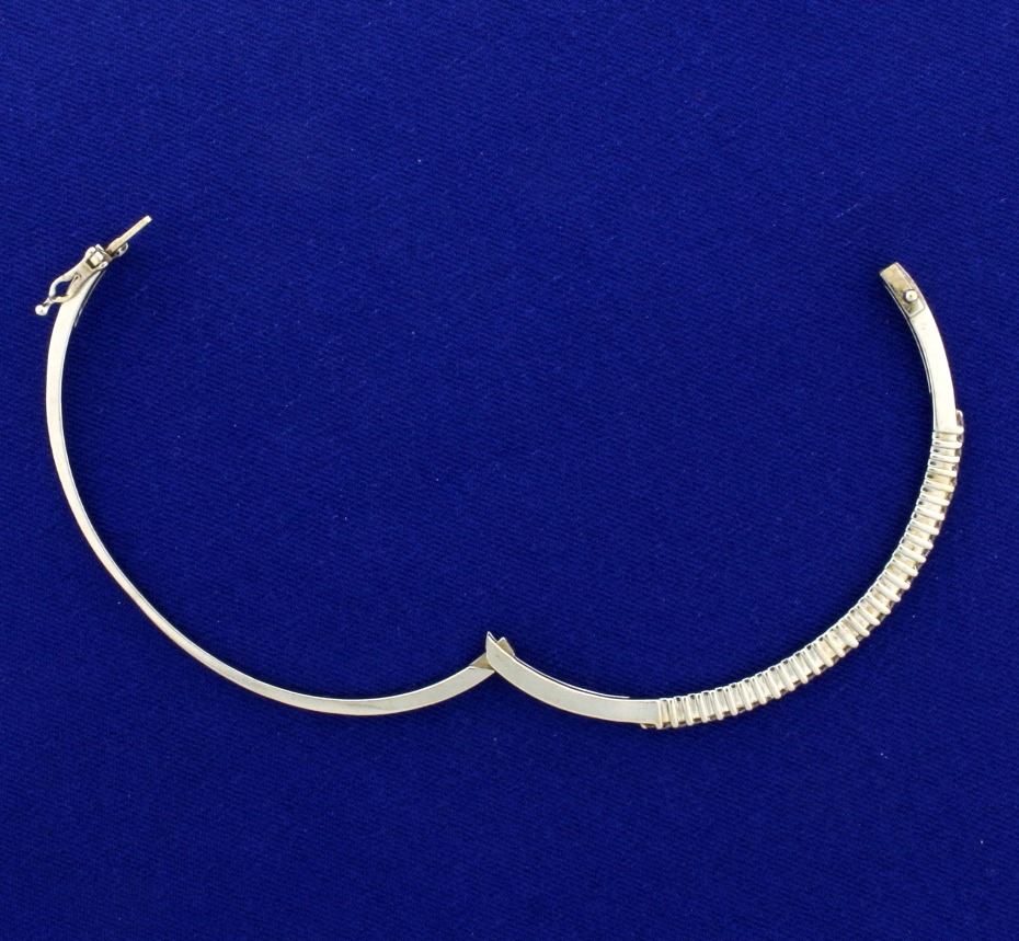 In 14k white gold, contains 1/2ct of high quality round brilliant diamonds of SI clarity/H color. 2 3/8" inside diameter- hinges open for easy put on/take off, with safety clasp. 12.6g.