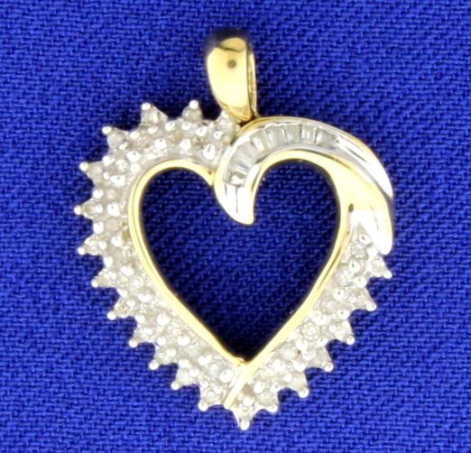 In 10K yellow gold, it is 1 inch long with bale, and contains 1/2ct total weight of round and baguette diamonds. 2.1g