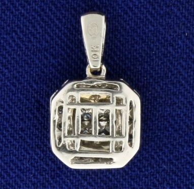 In 10k white gold. Contains four high quality .08ct square diamonds and nineteen .01ct round brilliant diamonds of SI clarity/H color. 5/8" long with bale. 1.4g.