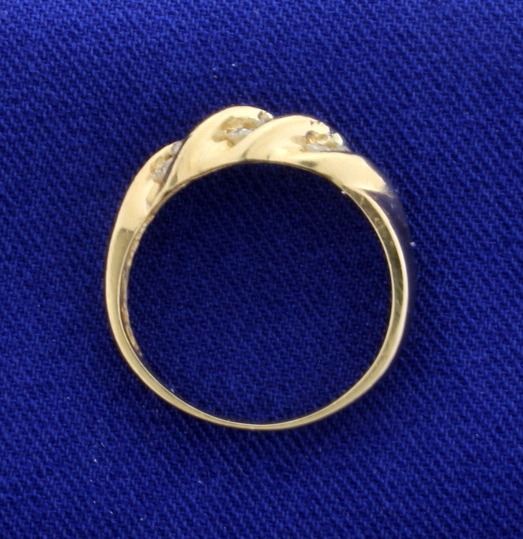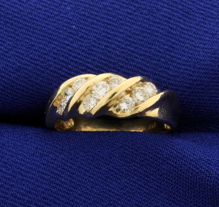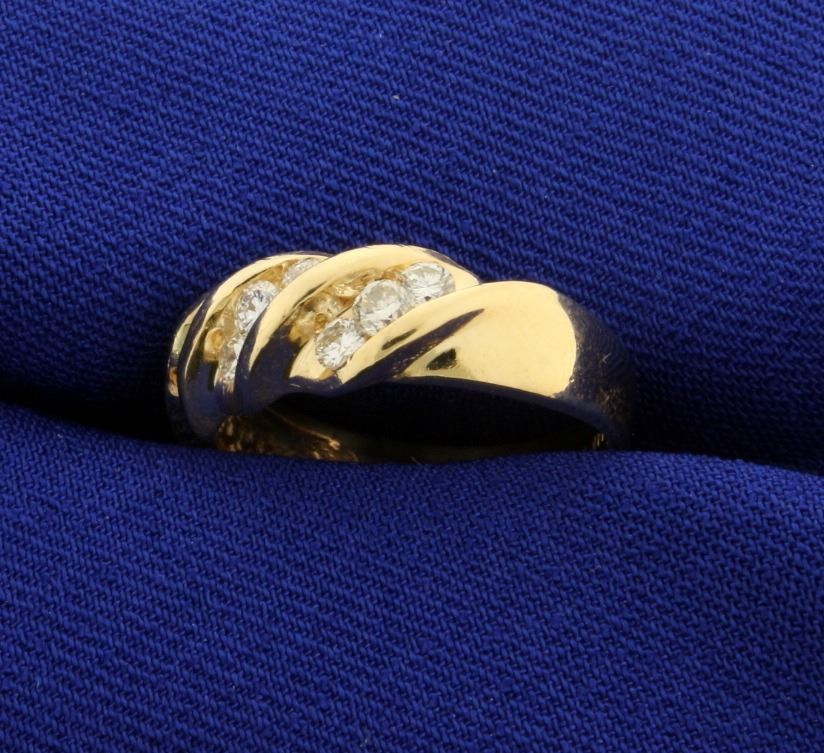 In 14k yellow gold this ring contains nine high quality diamonds. SI clarity/H color. Size 6      3.0g