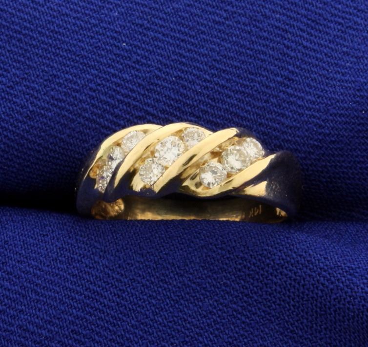 In 14k yellow gold this ring contains nine high quality diamonds. SI clarity/H color. Size 6 3.0g