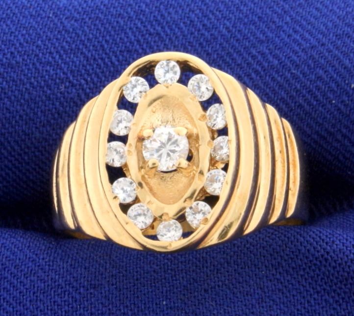 In 14k yellow gold. Center diamond is a high quality .15ct diamond surrounded by twelve .03ct diamonds. All of SI clarity/G color with lots of sparkle. Size 9 1/2. 6.5g.