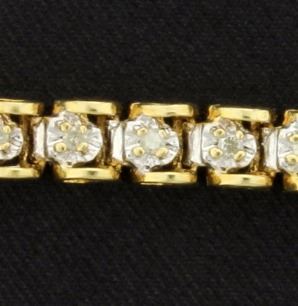 In 10K yellow gold, contains 1/2 ct TW of diamonds and is 7 1/4 inches long. It has a safety clasp as well. 9.2g