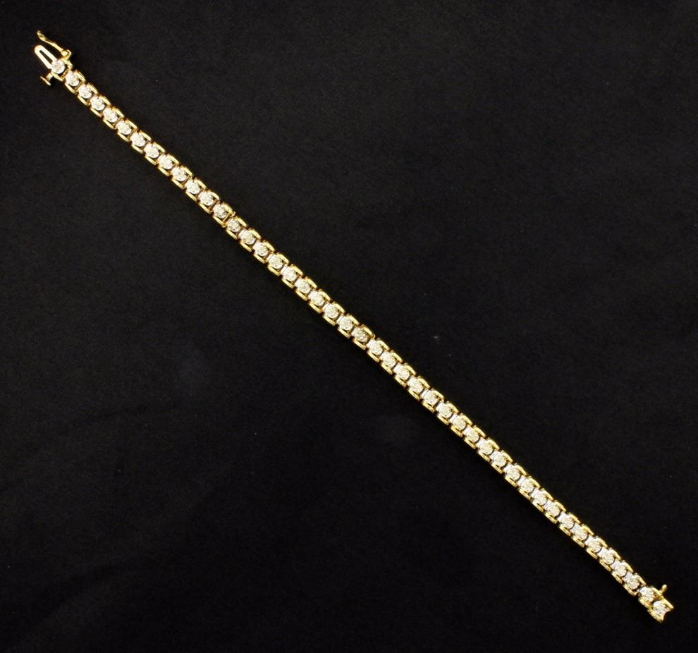 In 10K yellow gold, contains 1/2 ct TW of diamonds and is 7 1/4 inches long. It has a safety clasp as well. 9.2g
