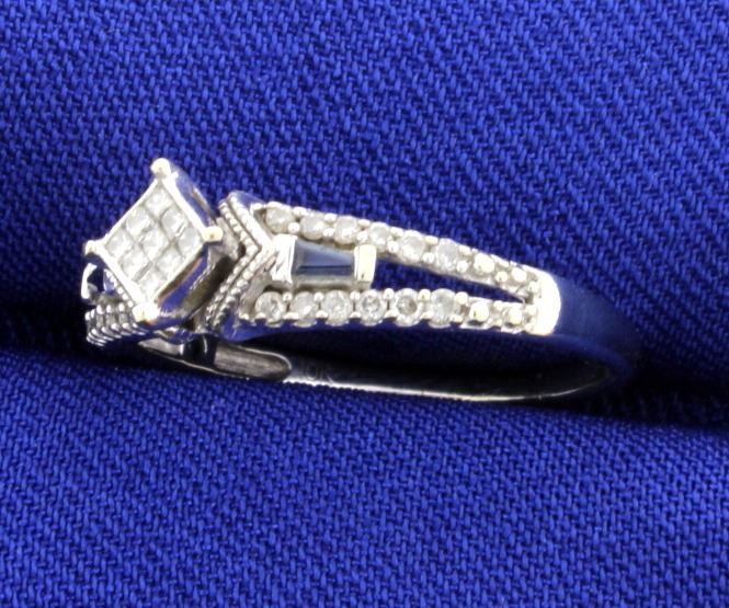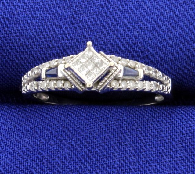 In 10K white gold, the ring contains 1/2ct total weight of round and invisible set princess cut diamonds. Also contains two 2.5mm baguette sapphires. Size 7 2.2g