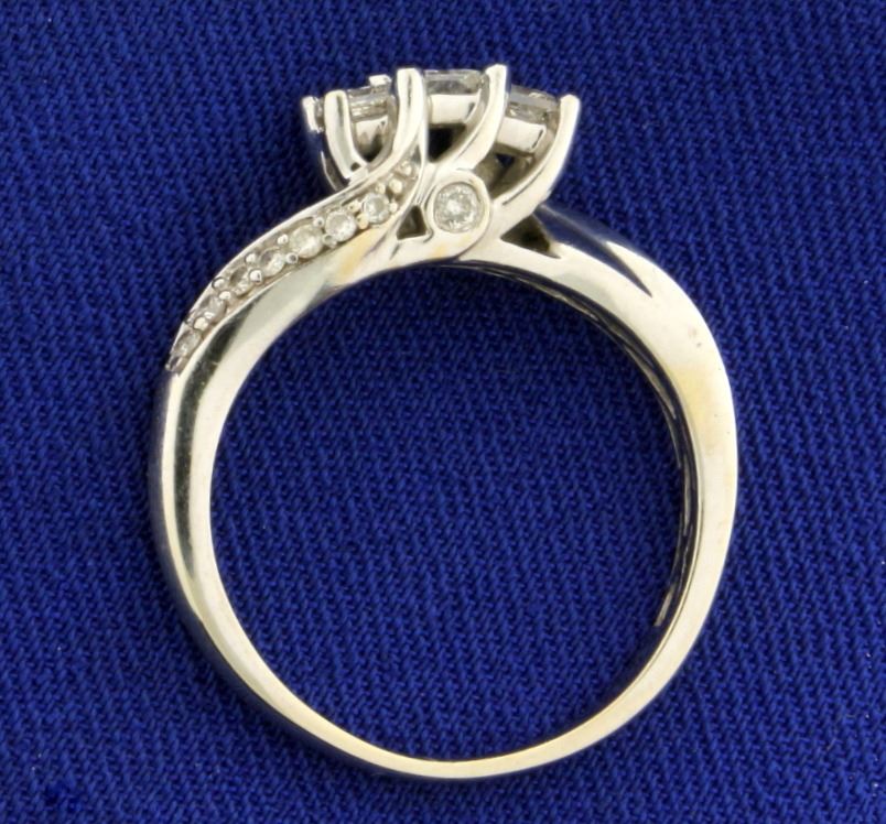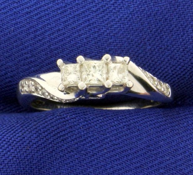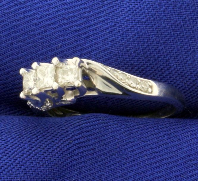 In 10k white gold. Contains one .15ct and two .1 ct high quality princess cut diamonds, SI clarity/H color. Also contains .15ct TW of round brilliant diamonds of similar high quality. Size 7. 2.7g.