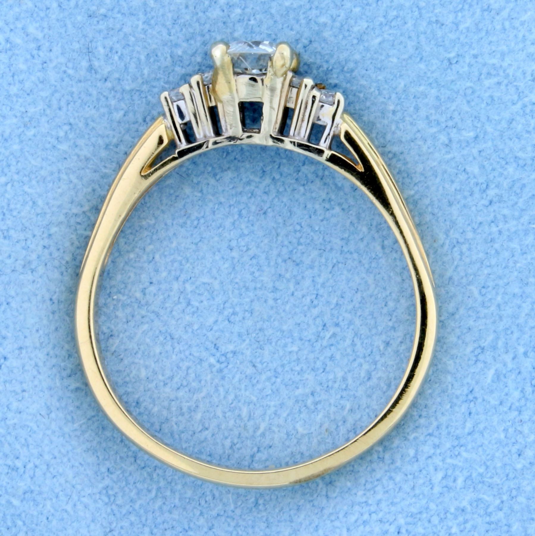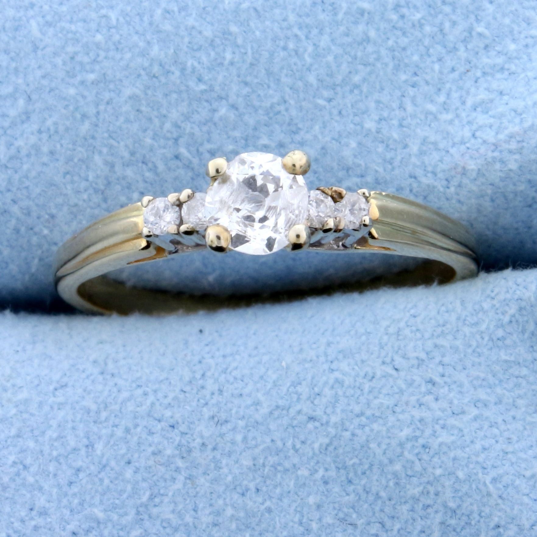 In 14K yellow gold. Contains a high quality center diamond that is .4ct, surrounded by four .03ct diamonds, all are G color/I1 clarity. Size 8 1/2 2.6g