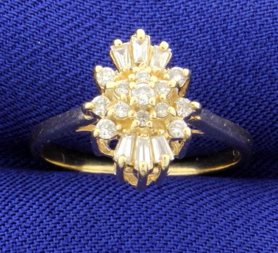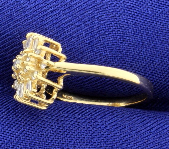 In 14K yellow gold, it has a very unique design of baguette & round diamonds (1/2ct total weight) which are H color/ SI clarity. Size 6 2.4g
