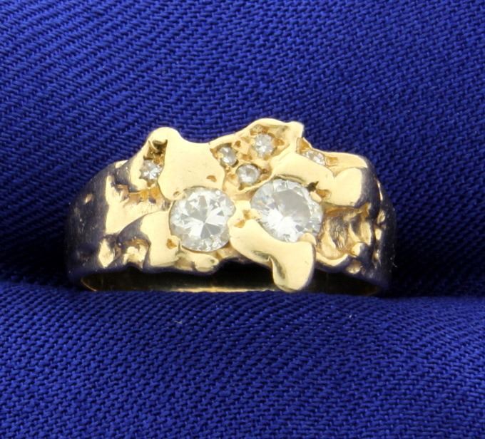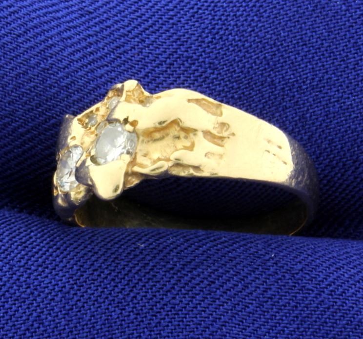 In 14K yellow gold this ring contains two .2ct and five .02ct diamonds, all high quality VS clarity/G color. Size 7 3/4 4.7g
