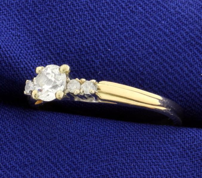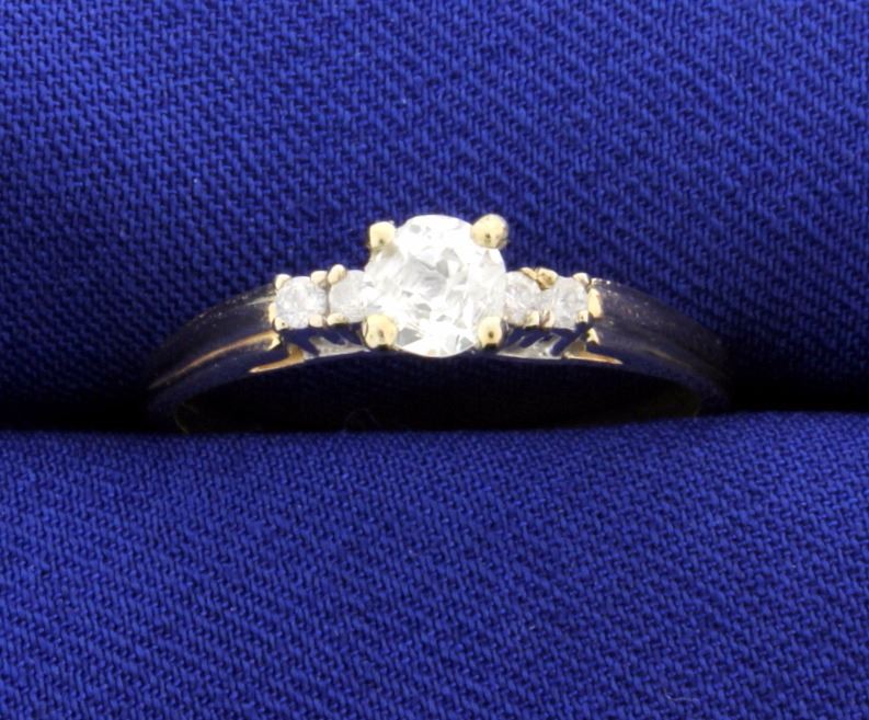 In 14K yellow gold there is a center diamond that is .4ct, it is surrounded by four .03ct diamonds, all are I1 clarity, G color. Size 8 1/2 2.6g