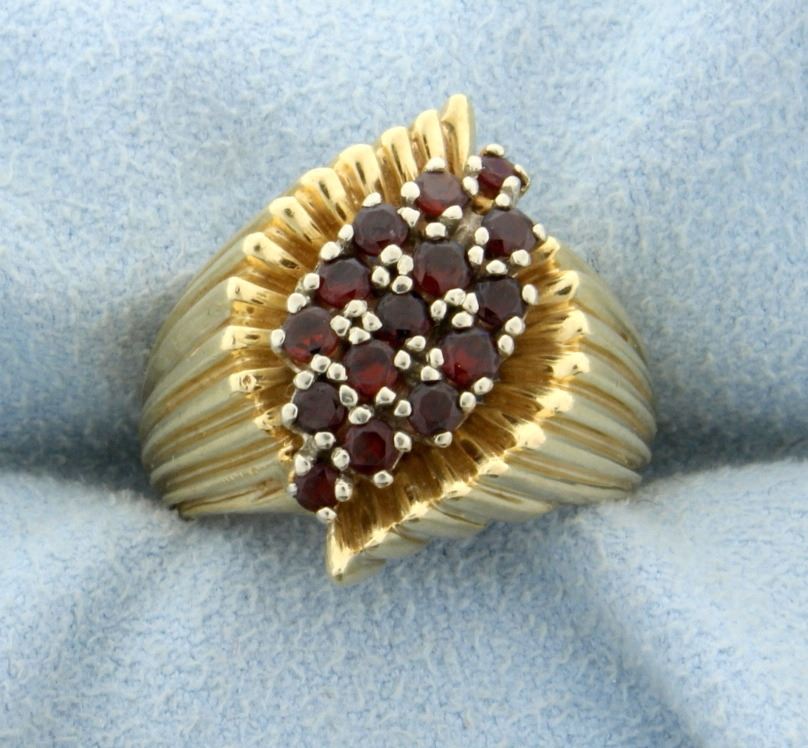 In 14K yellow gold, this ring contains 1/2ct total weight of round garnet gemstones. Size 5 1/2 8.4g